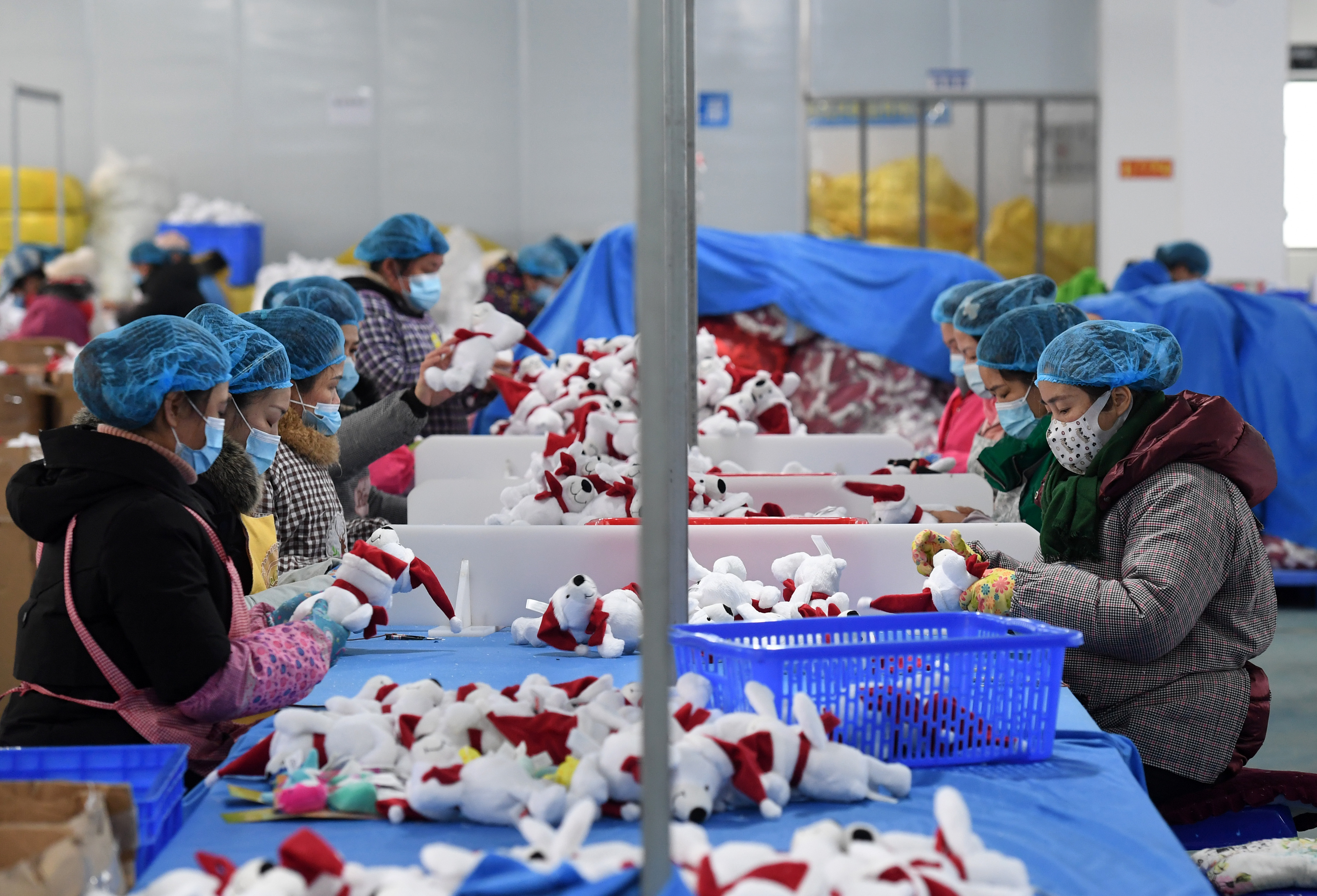 新华社照片,灵川(广西),2022年2月22日 广西灵川:企业节后生产忙 2月22日,在广西灵川县定江镇,一家企业的员工在生产玩具。 春节过后,广西灵川县众多企业随着员工陆续到位,全力推动节后复工复产,生产车间内一片繁忙。 新华社记者 陆波岸 摄