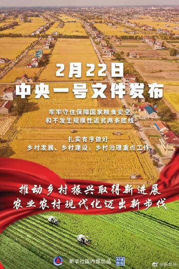【#权威快报#丨重磅!#2022年中央一号文件#发布】2月22日,《中共中央 国务院关于做好2022年全面推进乡村振兴重点工作的意见》,即2022年中央一号文件发布。这是21世纪以来第19个指导“三农”工作的中央一号文件。文件指出,牢牢守住保障国家粮食安全和不发生规模性返贫两条底线,突出年度性任务、针对性举措、实效性导向,充分发挥农村基层党组织领导作用,扎实有序做好乡村发展、乡村建设、乡村治理重点工作,推动乡村振兴取得新进展、农业农村现代化迈出新步伐。(记者侯雪静、于文静,海报设计杨轶群)