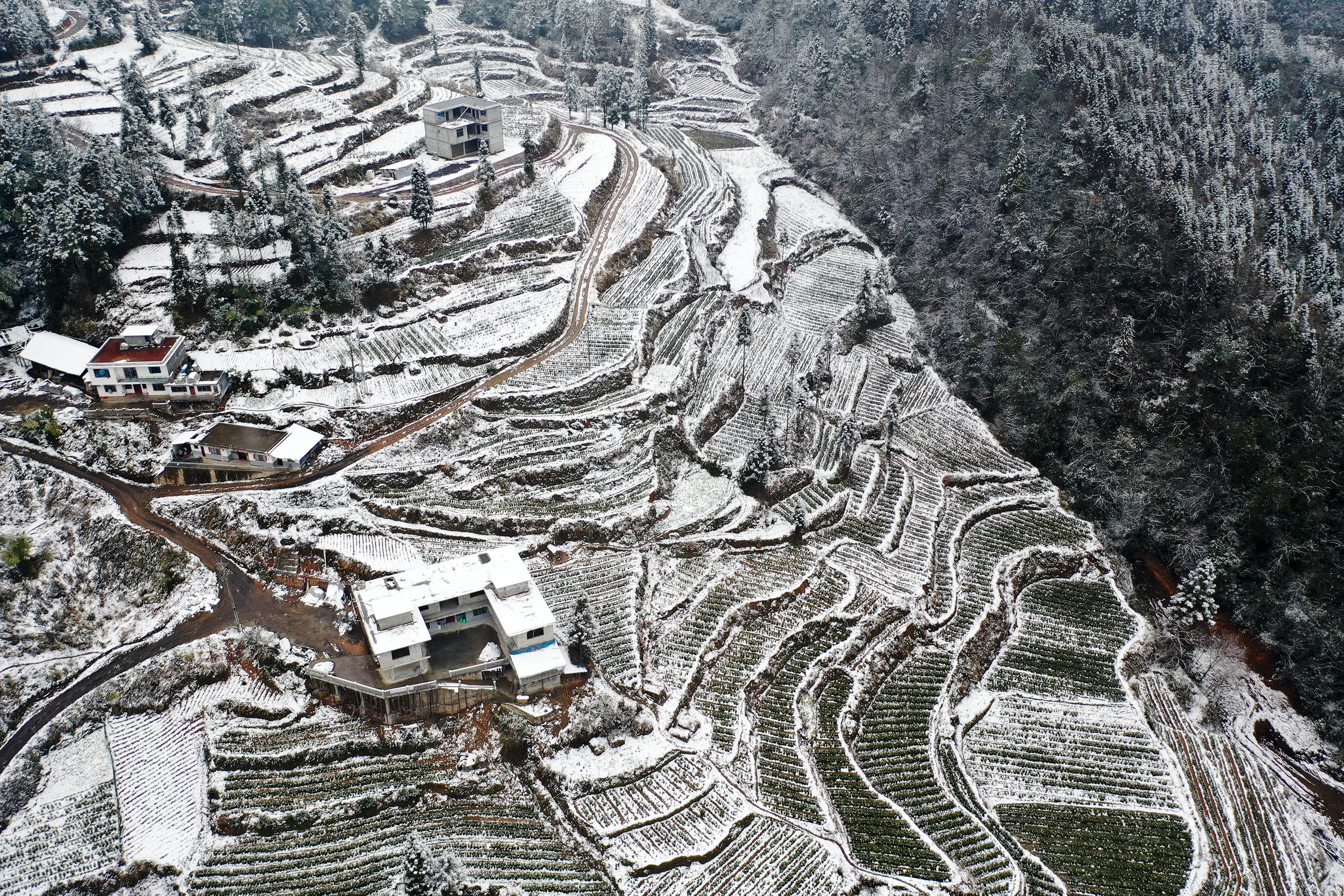 新华社照片,重庆,2022年2月22日 我国南方地区迎来大范围雨雪天气 2月22日拍摄的重庆市黔江区中塘镇双石村雪景(无人机照片)。 日前,受冷空气影响,我国南方地区迎来大范围雨雪天气,中央气象台2月22日18时发布暴雪蓝色预警。 新华社发(杨敏 摄)