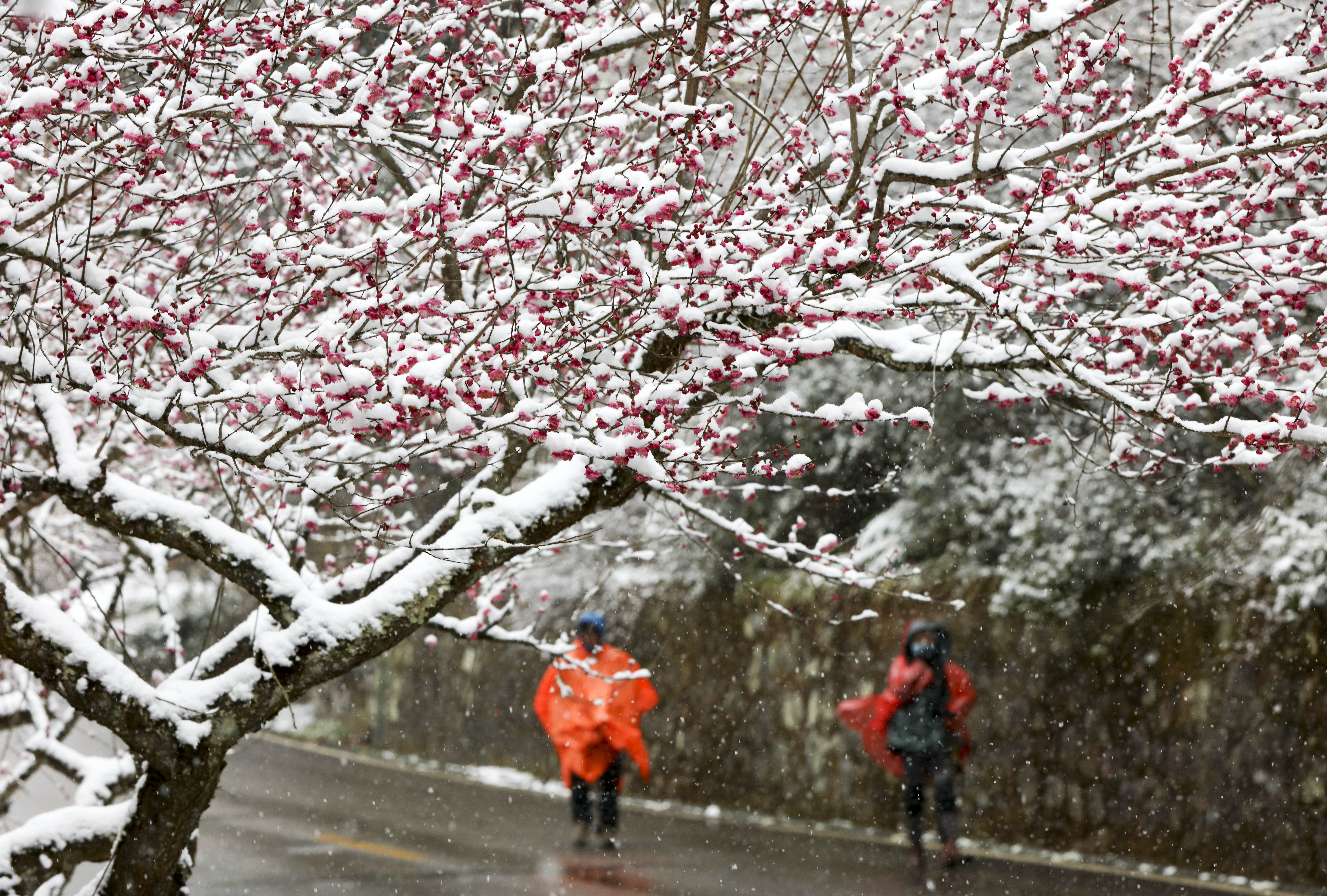 新华社照片,张家界(湖南),2022年2月22日 我国南方地区迎来大范围雨雪天气 2月22日,游人在湖南张家界景区黄石寨梅园踏雪赏梅。 日前,受冷空气影响,我国南方地区迎来大范围雨雪天气,中央气象台2月22日18时发布暴雪蓝色预警。 新华社发(吴勇兵 摄)