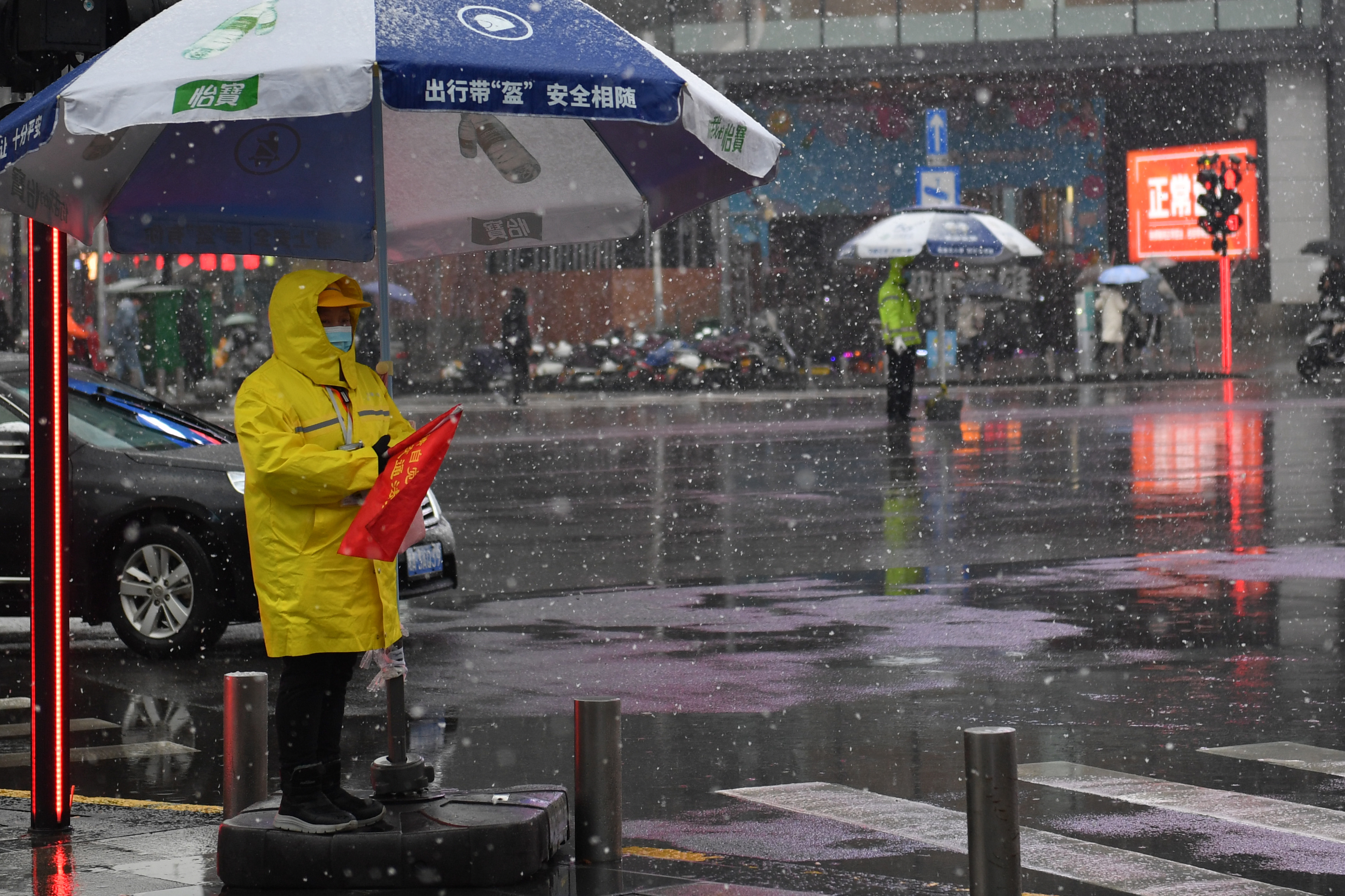 新华社照片,长沙,2022年2月22日 我国南方地区迎来大范围雨雪天气 2月22日,在长沙街头,交通劝导员(左)和交警在岗位上坚守。 日前,受冷空气影响,我国南方地区迎来大范围雨雪天气,中央气象台2月22日18时发布暴雪蓝色预警。 新华社记者 陈振海 摄