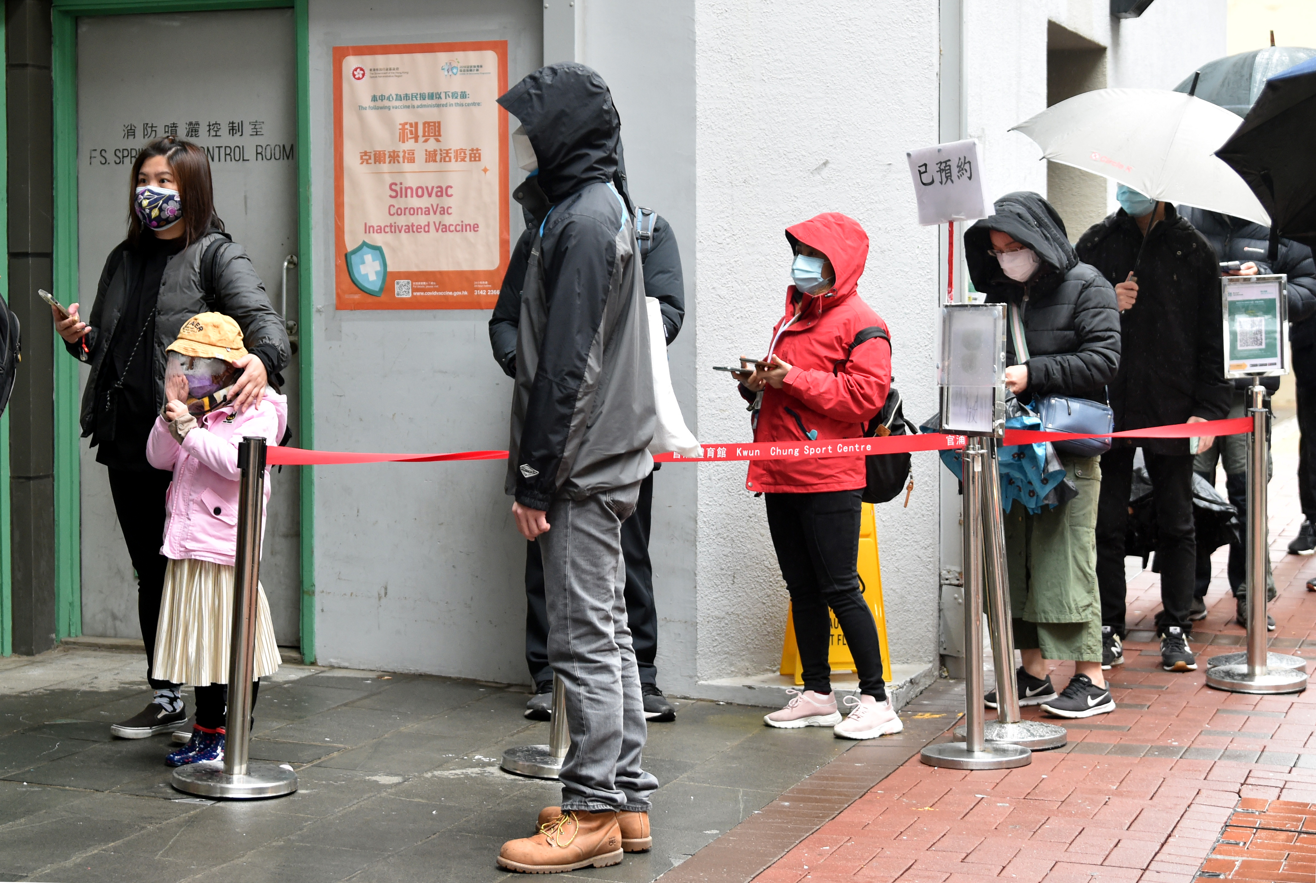 新华社照片,香港,2022年2月22日 香港新增6211例新冠肺炎确诊病例 2月22日,在香港佐敦疫苗接种中心站,市民佩戴口罩排队接种疫苗。 香港特区政府卫生署卫生防护中心22日公布,截至当日零时,香港新增6211例新冠肺炎确诊病例。 新华社记者 卢炳辉 摄