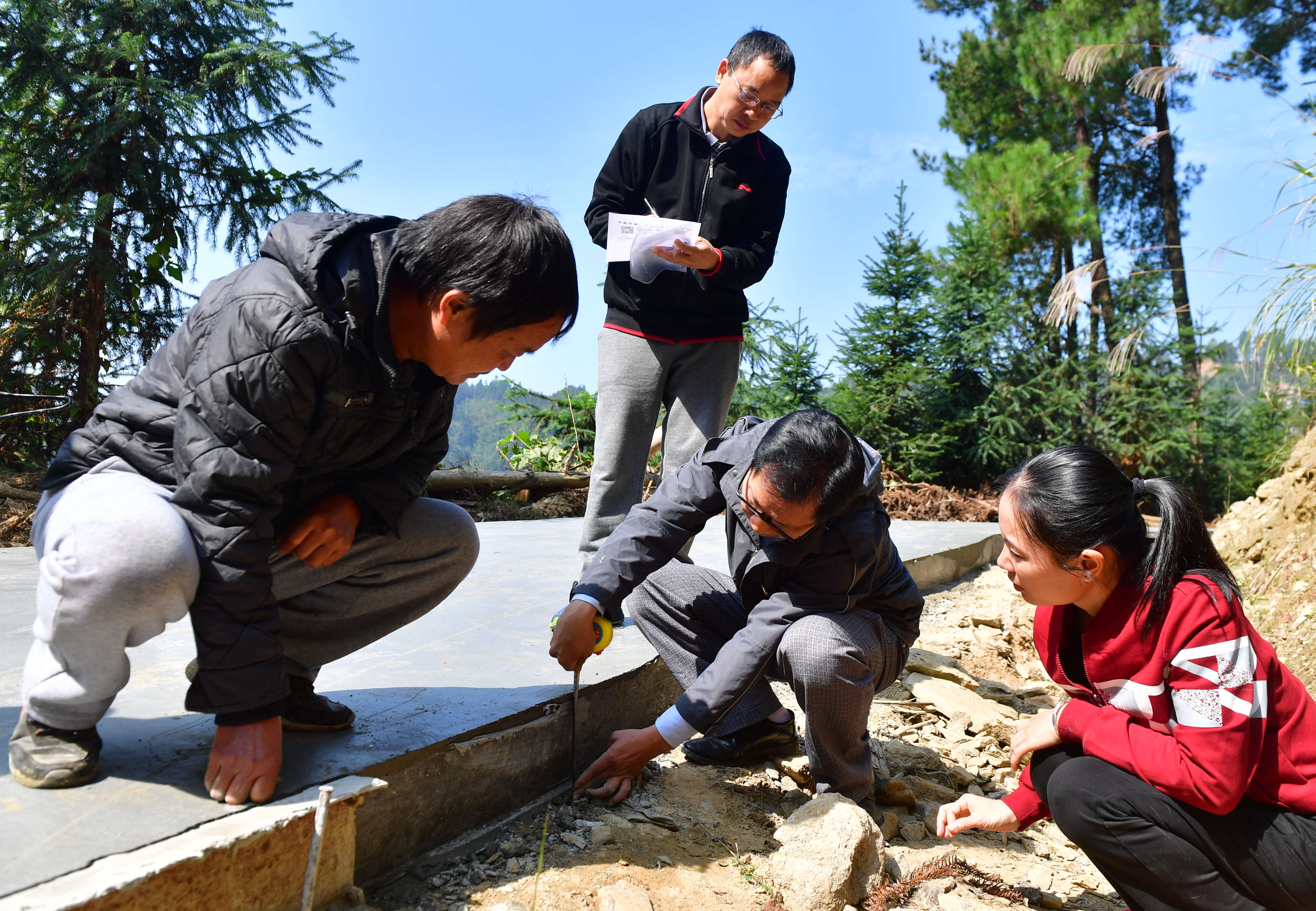 新华社照片,北京,2022年2月22日 “我们只有勇于自我革命才能赢得历史主动”——“十个明确”彰显马克思主义中国化新飞跃述评之十 在广西柳州市融水苗族自治县良寨乡培洞村,纪检监察干部(右一、二、三)在检查扶贫道路施工情况(2019年11月5日摄)。 (配本社同题文字稿) 新华社记者 黄孝邦 摄