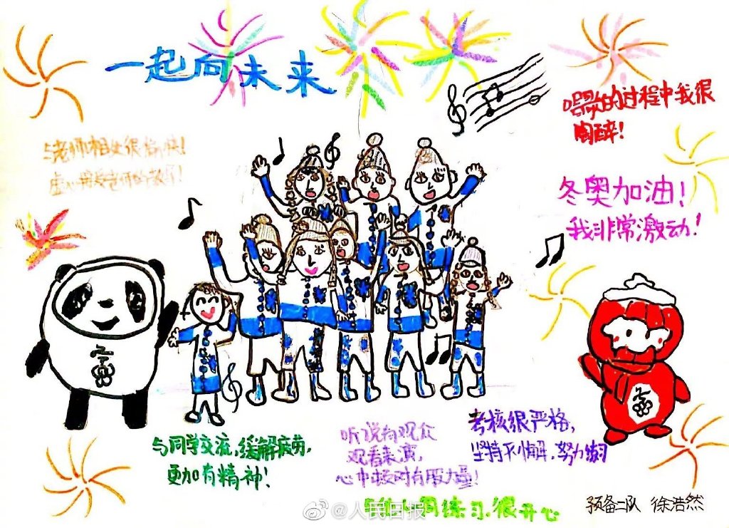 在冬奥开幕、闭幕式上两次演唱《雪花》的北京爱乐合唱团,是世界上唯一的双奥合唱团。冬奥闭幕式后,孩子们拿起画笔,用自己的方式为冬奥献上了特别的礼物:鸟巢上空的烟火、顶流冰墩墩与雪容融……网友:不光00后这届10后也能处,有冬奥他们真画!