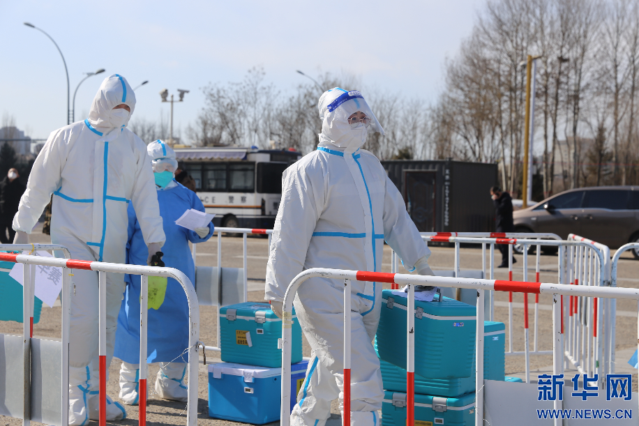 2月20日上午11时,籍东斌和工作人员将三个核酸采样点的样本送至方舱实验室核酸检测基地。新华网 李倩摄