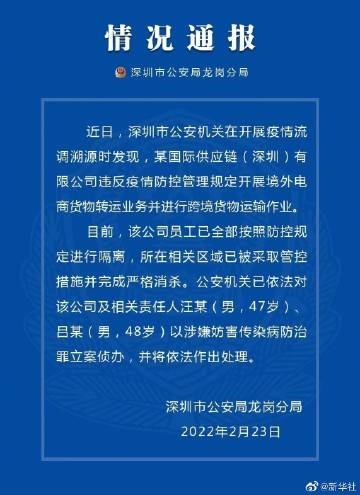 【#深圳一公司违反防疫规定开展境外电商货物转运# 责任人被立案调查】深圳市公安局龙岗分局23日通报,近日,公安机关在开展疫情流调溯源时发现,某国际供应链(深圳)有限公司违反疫情防控管理规定开展境外电商货物转运业务,并进行跨境货物运输作业。