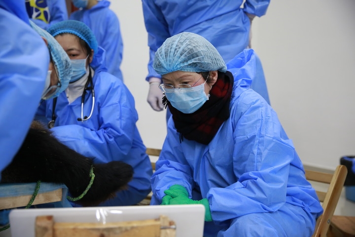 全国人大代表、成都大熊猫繁育研究基地研究中心主任侯蓉(右一)为大熊猫“蜀庆”检查身体(2019年2月1日摄)。(成都大熊猫繁育研究基地供图)