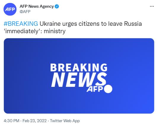 据彭博、法新社2月23日报道,乌克兰外交部敦促公民“立即”离开俄罗斯。