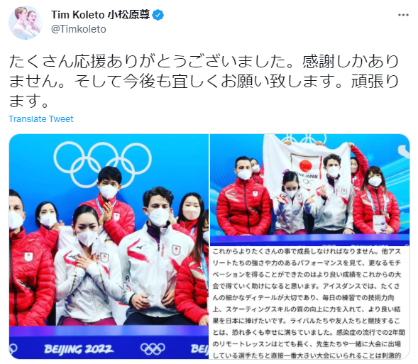 小松原尊和小松原美里是花滑冰舞“跨国夫妻档”,小松原尊原名为蒂姆·科莱托,曾经是美国人,妻子美里则是土生土长的日本人。两人因滑冰结缘,今年北京冬奥会是他们的奥运首秀。在首体练习时,两人曾兴奋表示,“这是我们竞技生涯中遇到的最美的冰。”小松原尊特别表示,登上冬奥会的舞台已是幸运,会竭尽全力发挥最大优势,不问成败。