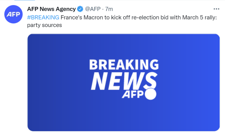 【环球网快讯】法新社刚刚消息,法国总统马克龙将在3月5日的集会中启动其连任竞选活动。