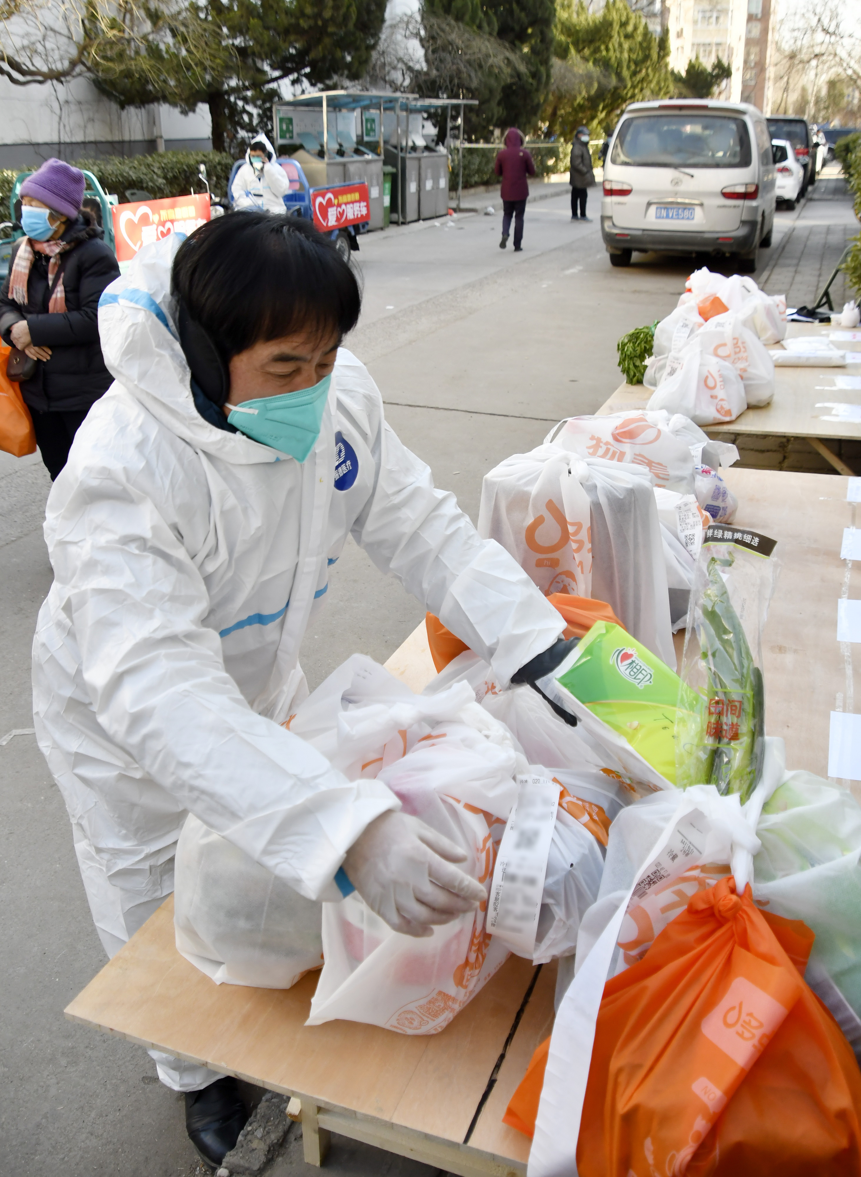 新华社照片,北京,2022年2月23日 北京:全力抗击新冠疫情 2月23日,丰台区东高地街道的社区工作人员在封控区内为居民接收外卖、快递等包裹。 北京市卫生健康委2月23日通报,2月22日0时至24时,北京市新增10例本土确诊病例,其中4例已通报,无新增疑似病例和无症状感染者;新增8例境外输入确诊病例, 无新增疑似病例和无症状感染者。治愈出院3例。 新华社记者李欣摄