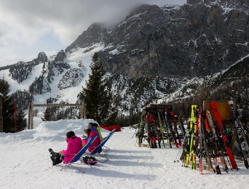 2月19日,在意大利科尔蒂纳丹佩佐,冰雪运动爱好者们在高山滑雪场享受阳光。新华社记者 刘咏秋 摄
