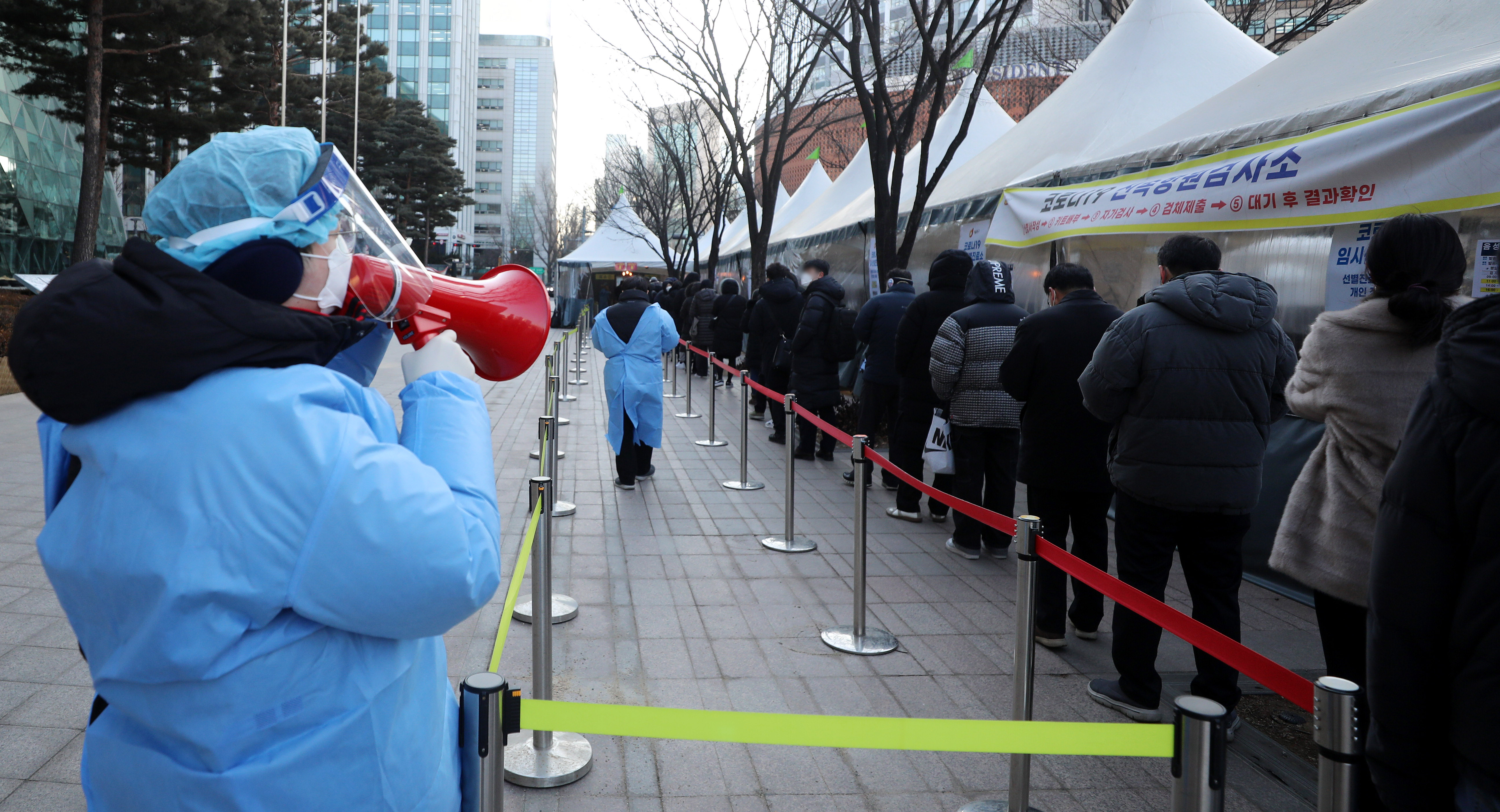 新华社照片,首尔,2022年2月23日 (国际疫情)(3)韩国:日增新冠病例再创新高 2月23日,人们在韩国首尔一处新冠病毒检测点排队等待检测。 韩国卫生部门23日通报,由于变异新冠病毒奥密克戎毒株持续传播,韩国22日新增新冠确诊病例17.1万例,比一周前几乎翻倍,再次刷新日增病例数新高。 新华社/纽西斯通讯社