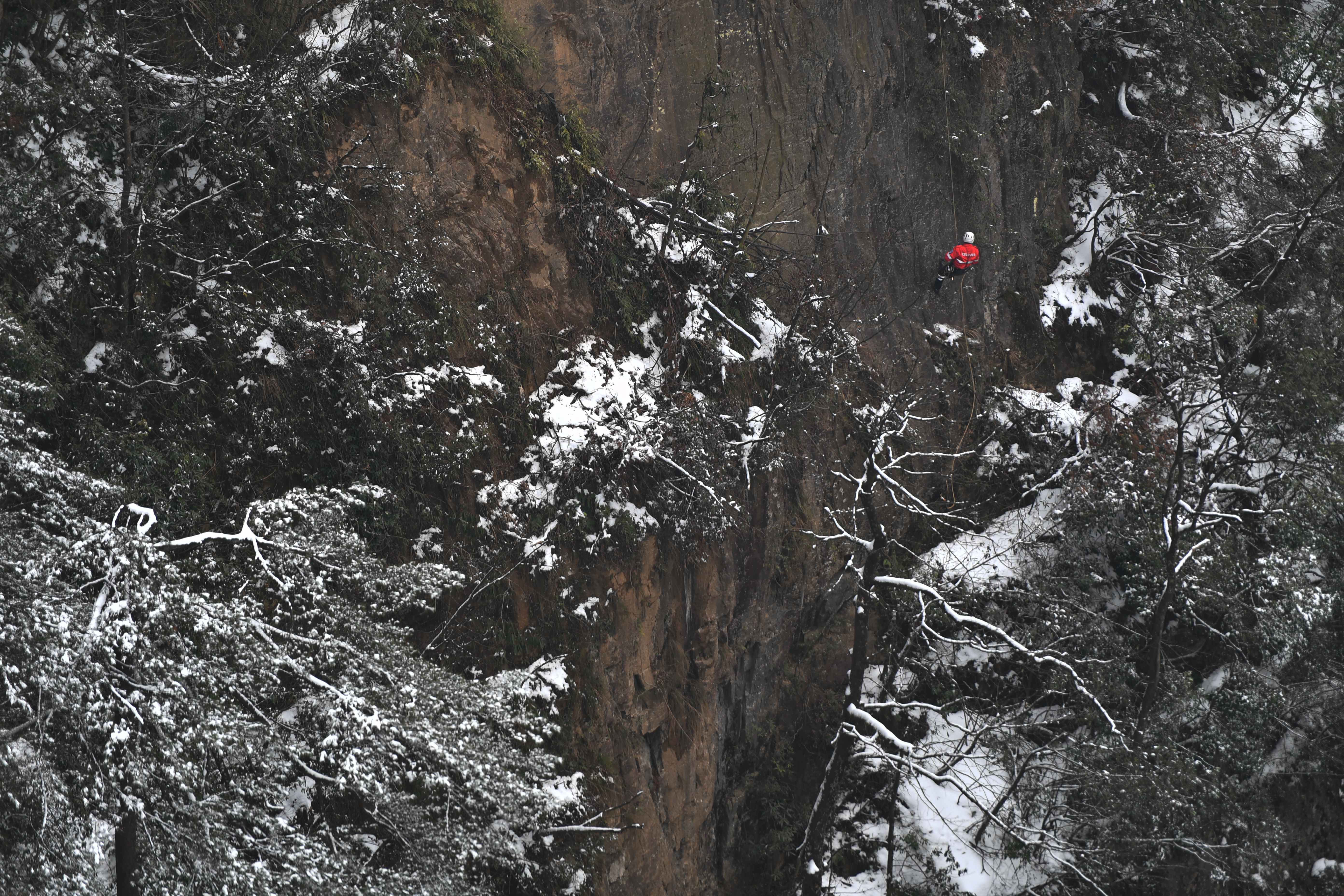 新华社照片,张家界(湖南),2022年2月23日 峰林踏雪探“侠”踪 2月23日,张家界市武陵源山地应急救援队一名队员在黄石寨进行索降训练。 当日,湖南张家界雪后初霁,张家界市武陵源山地应急救援队队员来到黄石寨景区,在悬崖峭壁间开展低温冰雪条件下的应急救援索降训练,以提高应对恶劣气候和环境下的应急救援能力。这支救援队每年不定期组织训练,被游客亲切地称为“红衣侠”。 新华社记者 赵众志 摄