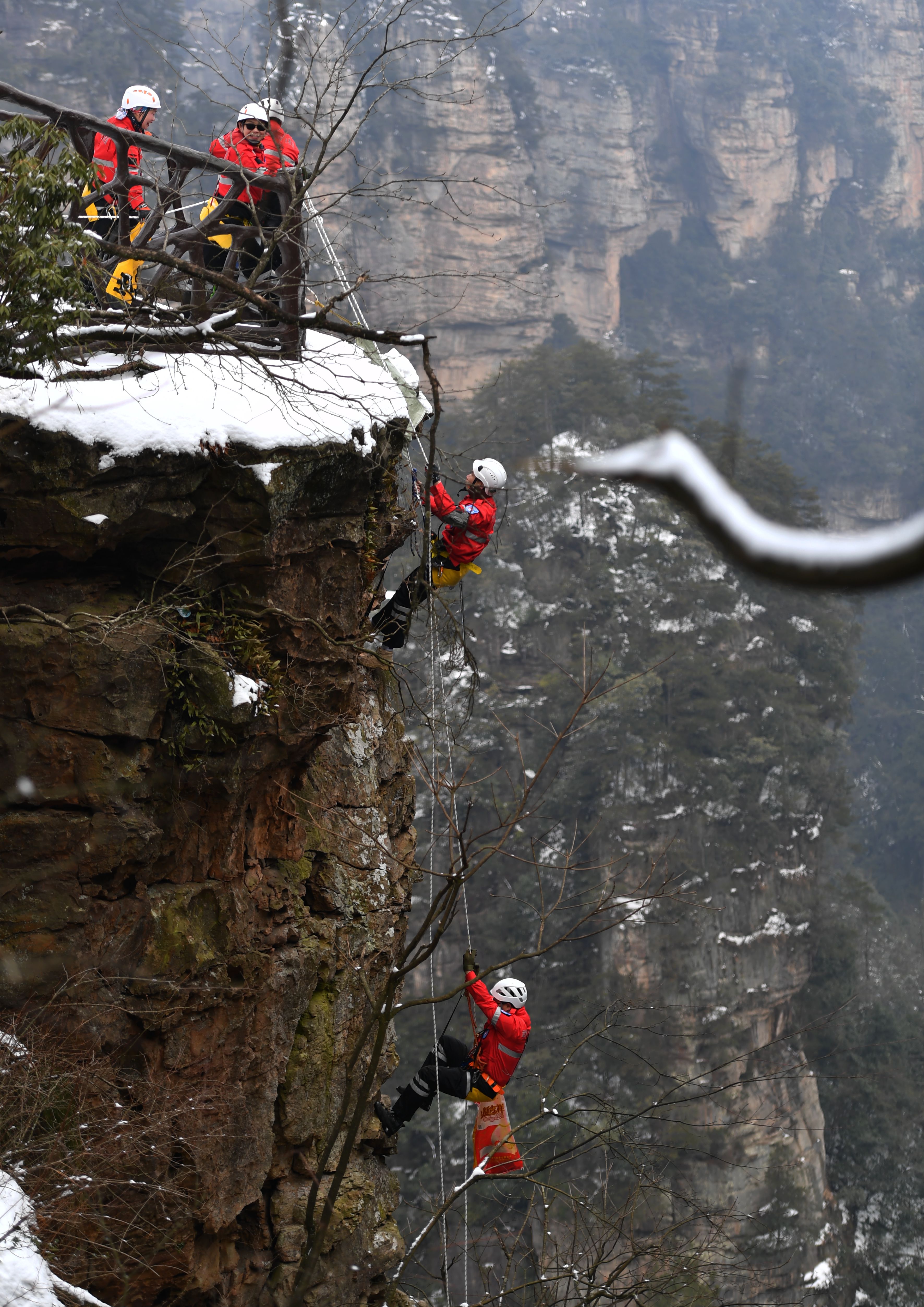 新华社照片,张家界(湖南),2022年2月23日 峰林踏雪探“侠”踪 2月23日,张家界市武陵源山地应急救援队队员在训练中。 当日,湖南张家界雪后初霁,张家界市武陵源山地应急救援队队员来到黄石寨景区,在悬崖峭壁间开展低温冰雪条件下的应急救援索降训练,以提高应对恶劣气候和环境下的应急救援能力。这支救援队每年不定期组织训练,被游客亲切地称为“红衣侠”。 新华社记者 赵众志 摄