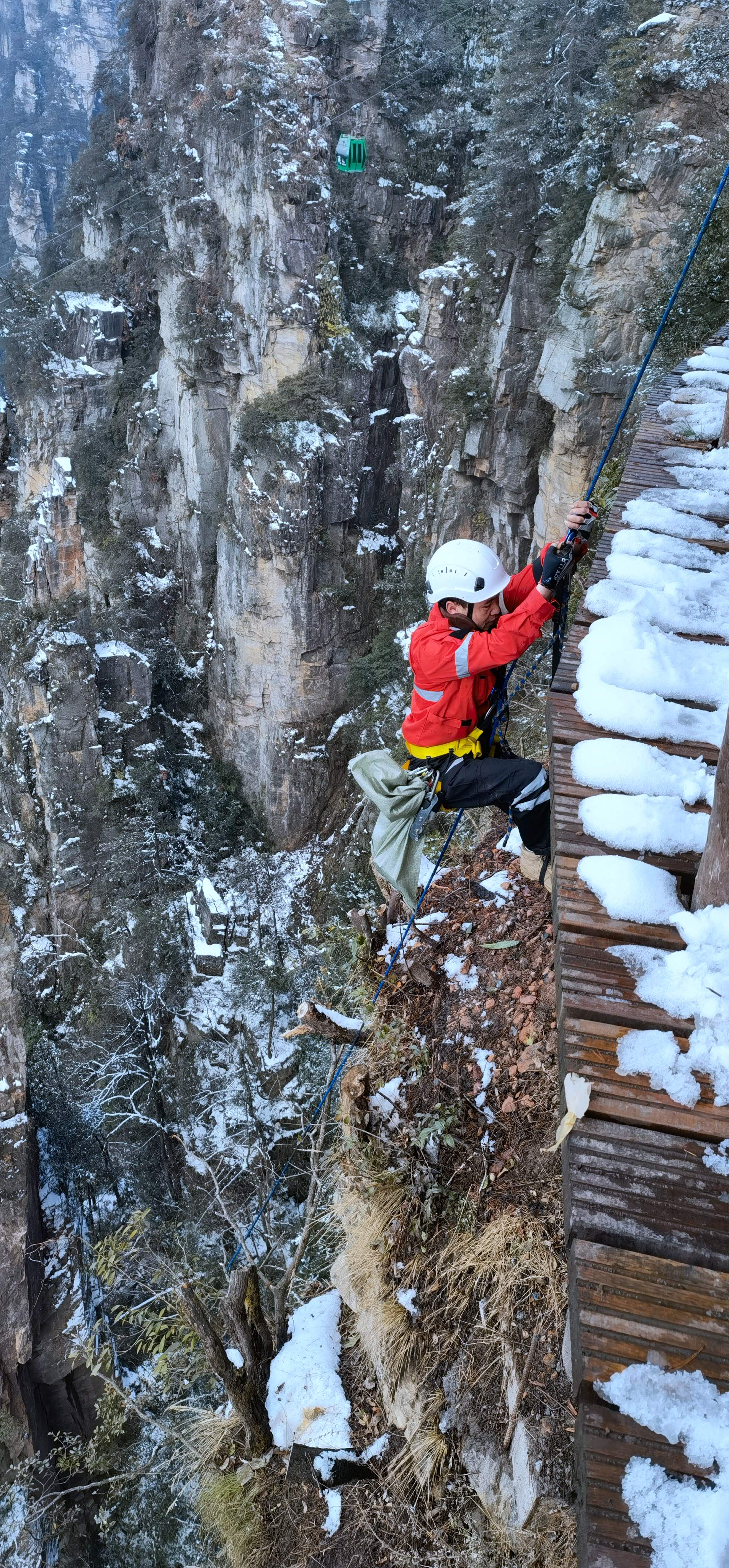 新华社照片,张家界(湖南),2022年2月23日 峰林踏雪探“侠”踪 2月23日,张家界市武陵源山地应急救援队一名队员在黄石寨进行索降训练(手机照片)。 当日,湖南张家界雪后初霁,张家界市武陵源山地应急救援队队员来到黄石寨景区,在悬崖峭壁间开展低温冰雪条件下的应急救援索降训练,以提高应对恶劣气候和环境下的应急救援能力。这支救援队每年不定期组织训练,被游客亲切地称为“红衣侠”。 新华社记者 赵众志 摄