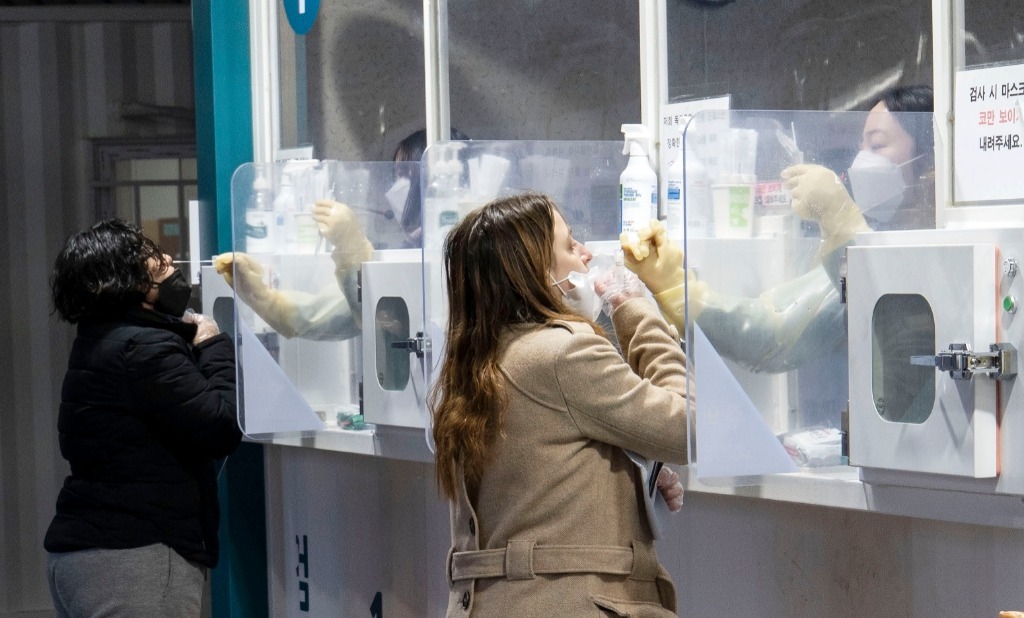 2月16日,医护人员在韩国首尔一处新冠病毒检测点为检测者采样。(新华社发,李相浩摄)