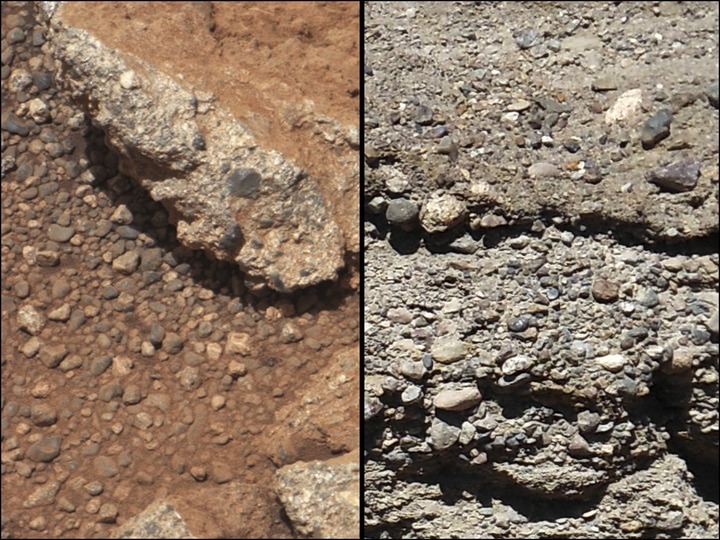 图为2012年9月27日美国航天局提供的“好奇”号火星车传回的图像(左)显示火星上有与地球河床(右)类似的迹象。(新华社/路透)