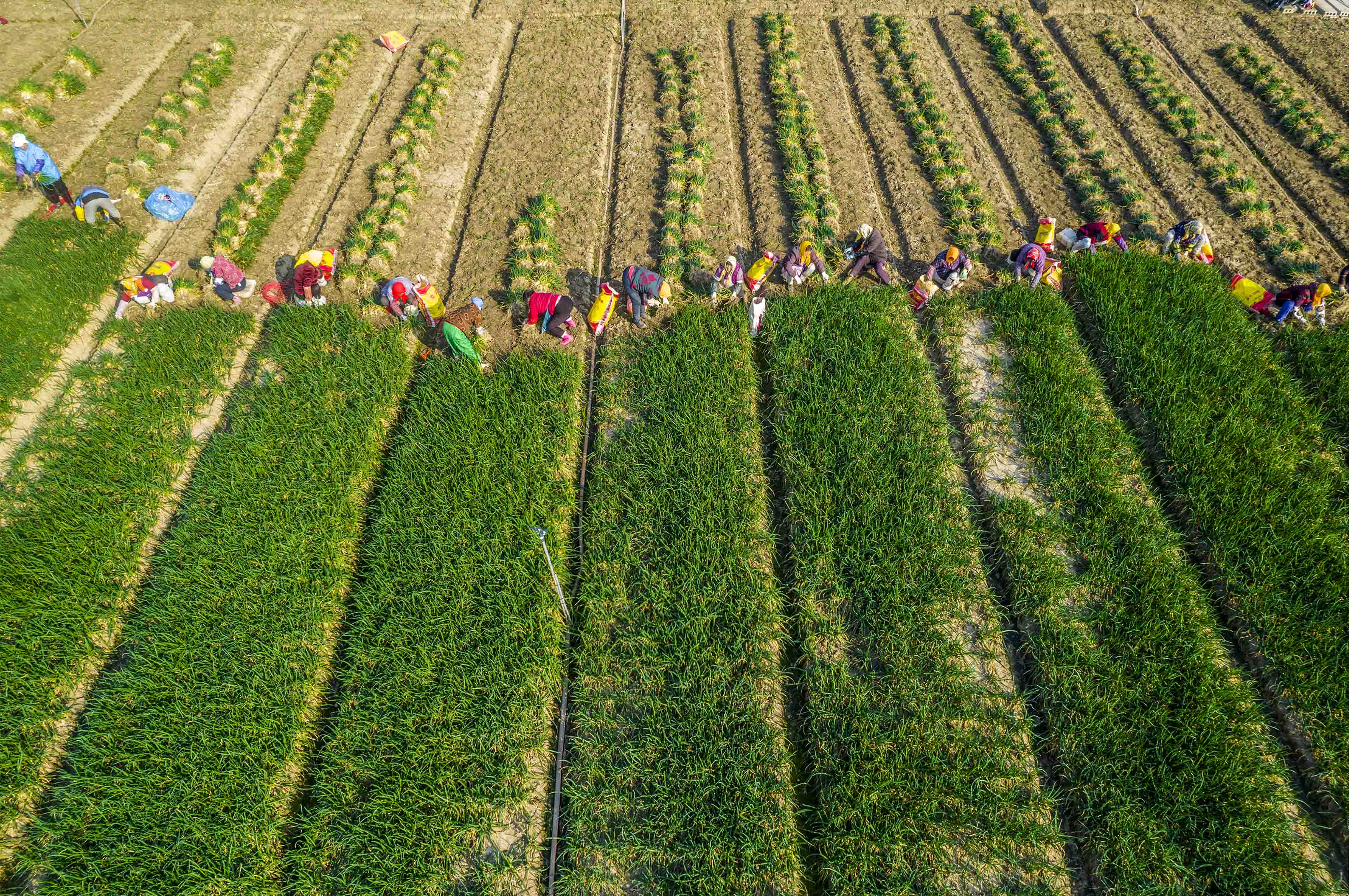 新华社照片,兴化(江苏),2022年2月23日 早春时节抢抓农时 2月23日,江苏省兴化市垛田街道王横村农民在收获香葱(无人机照片)。 早春时节,各地农民抢抓农时,加紧春季农业生产,田间地头一派人勤春早忙碌景象。 新华社发(汤德宏 摄)