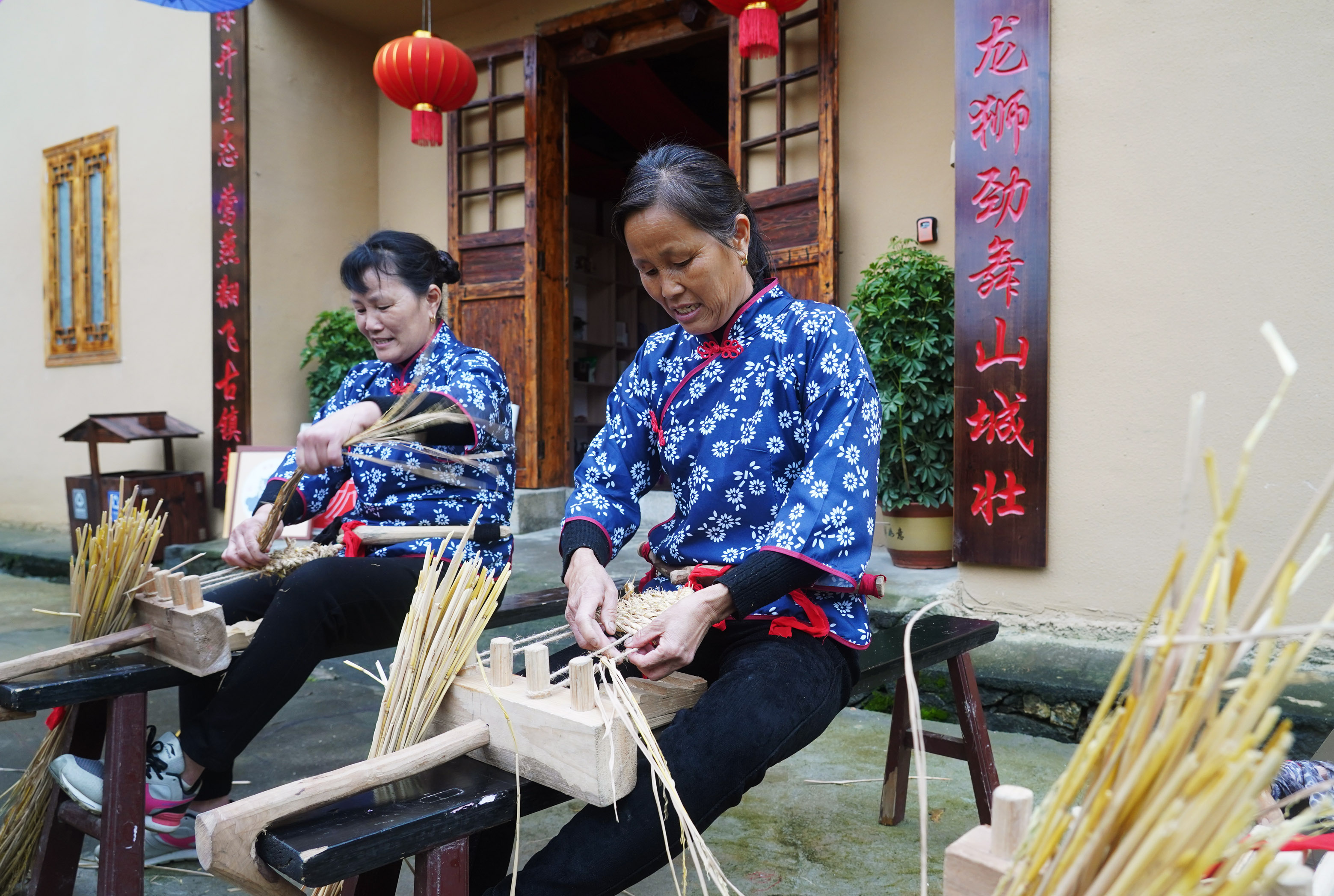 新华社照片,南昌,2022年2月23日 星火再燎原——来自我国首个脱贫摘帽县井冈山的回访 在江西省井冈山市古田村,村民在编草鞋纪念品(2021年4月28日摄)。 (配本社同题文字稿) 新华社记者 万象 摄