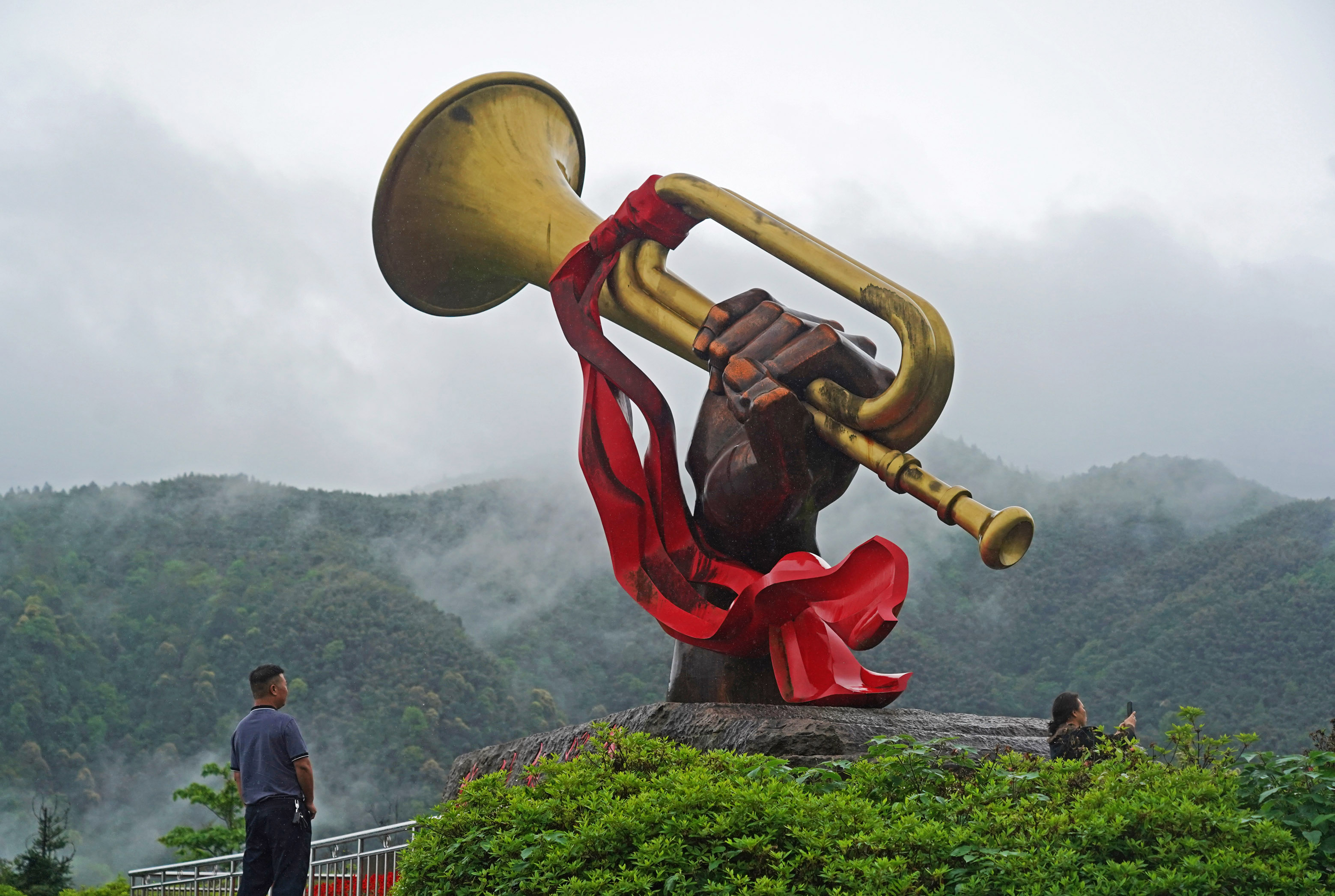 新华社照片,南昌,2022年2月23日 星火再燎原——来自我国首个脱贫摘帽县井冈山的回访 游客在江西省井冈山市参观“胜利的号角”雕塑(2021年4月27日摄)。 (配本社同题文字稿) 新华社记者 万象 摄