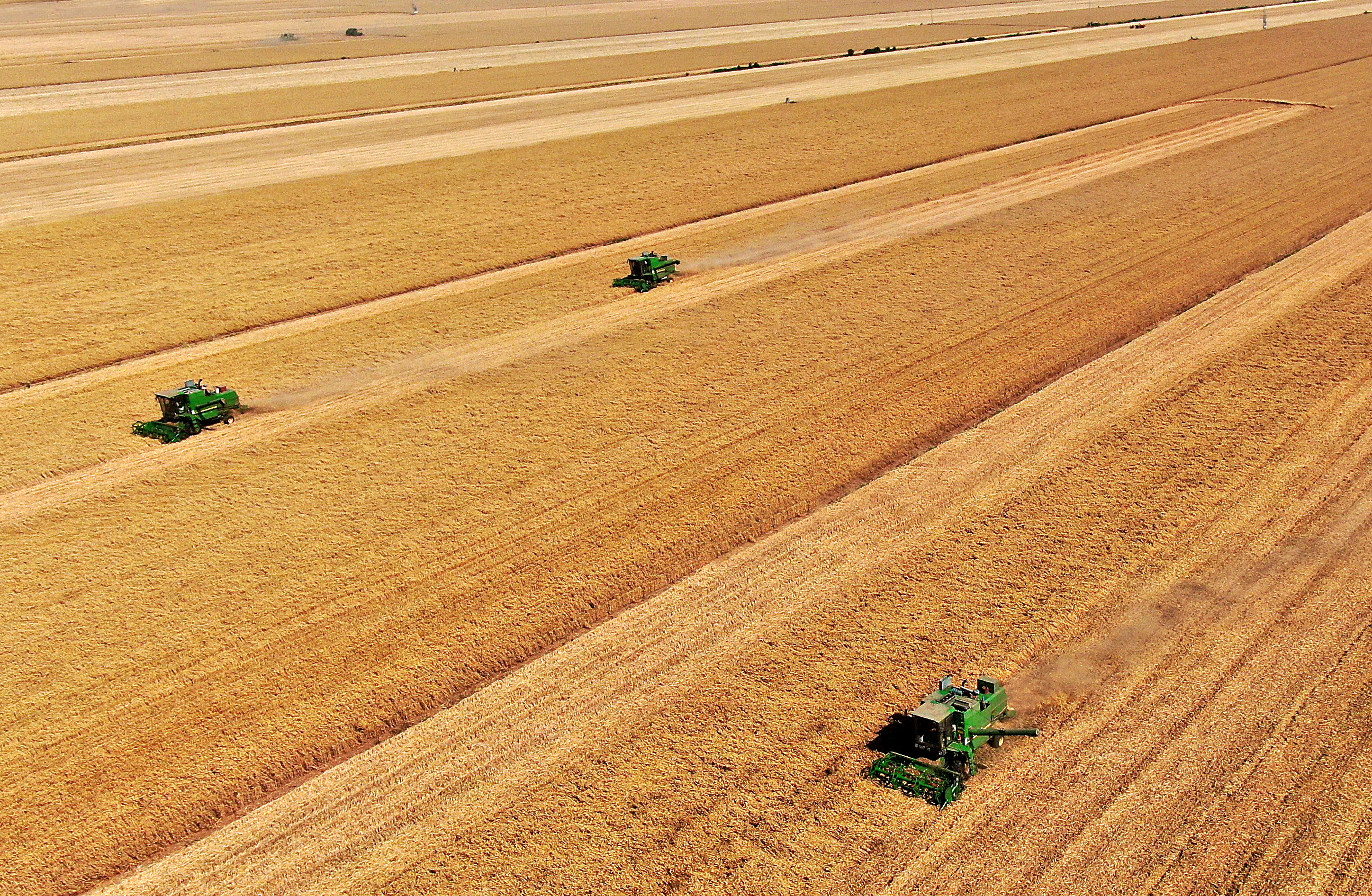 新华社照片,北京,2022年2月23日 让当代中国马克思主义放射出更加灿烂的真理光芒——“十个明确”彰显马克思主义中国化新飞跃 在河南省黄泛区农场九分场的麦田里,农机手操作收割机收获小麦(无人机照片,2021年6月6日摄)。 (配本社同题文字稿) 新华社记者 李安 摄