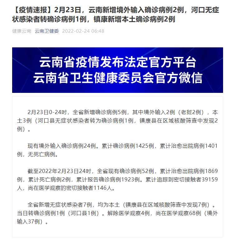 2月23日,云南新增境外输入确诊病例2例,河口无症状感染者转确诊病例1例,镇康新增本土确诊病例2例