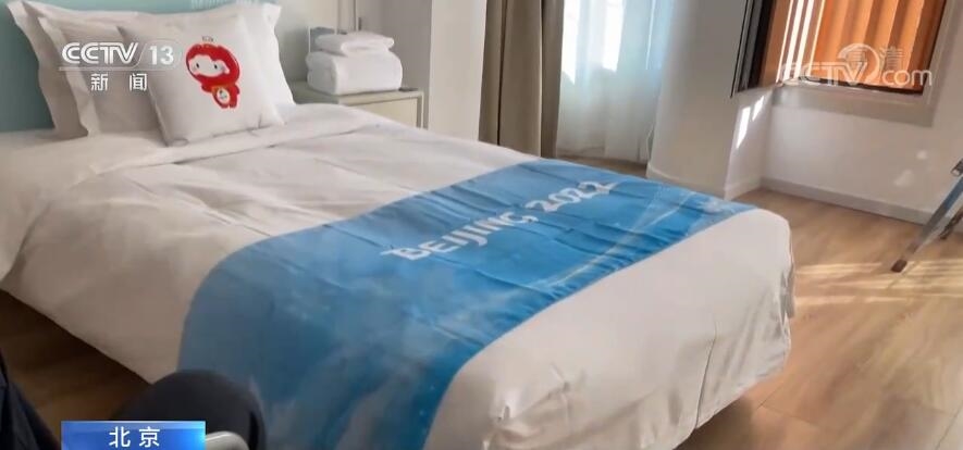 这是冬残奥运动员公寓的样板间,有很多无障碍的设施。比如说,所有的门都是单臂可以操作的推拉门,还有扶手、浴凳等等。我们再来卧室里面看看,这是给坐轮椅运动员使用的床,床脚相对于冬奥会的时候降低了10公分,便于上下床。我们看到床头有一个抱枕。这面是北京冬残奥会的会徽“飞跃”,这一面是北京冬残奥会的吉祥物“雪容融”。(抱枕)打开之后就能成为一个毯子,有冬残奥会各项目的运动图标,这个抱枕到时候是送给运动员。