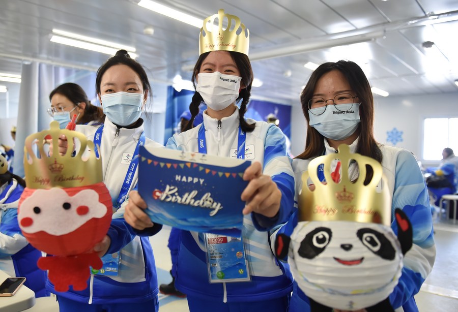 2月15日,在北京奥林匹克公园公共区志愿者之家,志愿者们展示制作好的灯笼和生日贺卡。新华社记者 陈钟昊 摄
