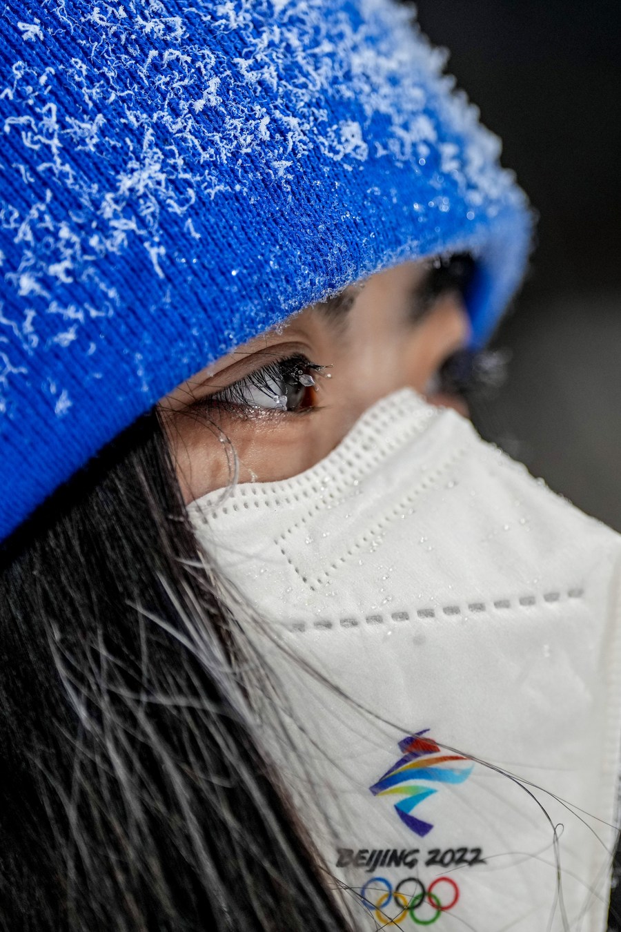 2月9日晚,在国家越野滑雪中心,一位冬奥会志愿者的睫毛上结出冰珠。新华社记者 彭子洋 摄