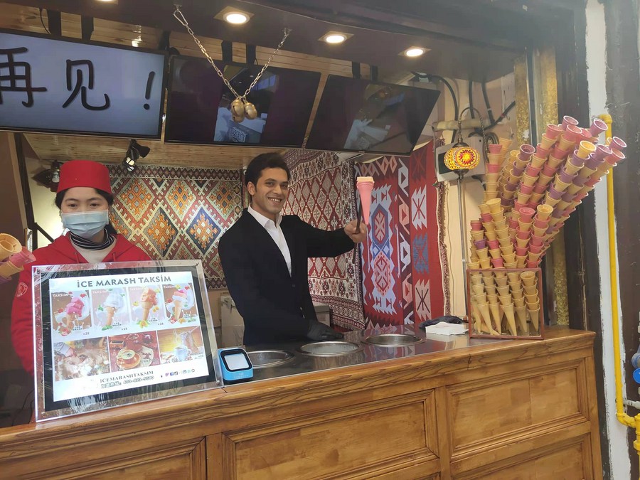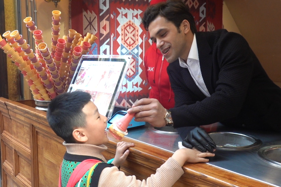 “中国是许多土耳其人出国的首选目的地,我从家乡招聘了不少人来中国工作。这里的收入可观,许多亲戚和朋友都愿意来。但是他们得经过一年的专业培训,才能到我的冰淇淋店上班。”阿里说。