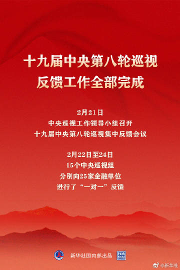 【#权威快报#丨#十九届中央第八轮巡视反馈工作全部完成#】根据党中央部署,十九届中央第八轮巡视向25家金融单位反馈工作近日全部完成。本轮巡视反馈采取召开集中反馈会议和各中央巡视组“一对一”反馈相结合的方式进行。(记者孙少龙,海报设计乔昕)