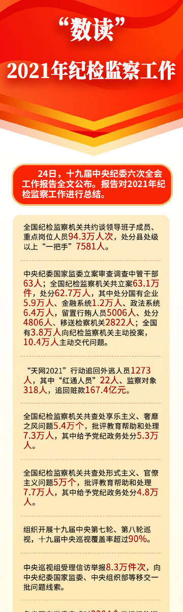 【一图速览|“数读”#2021年纪检监察工作#】24日,#十九届中央纪委六次全会工作报告#全文公布。报告对过去一年纪检监察工作进行总结。2021年纪检监察工作有哪些亮点?请戳大图↓