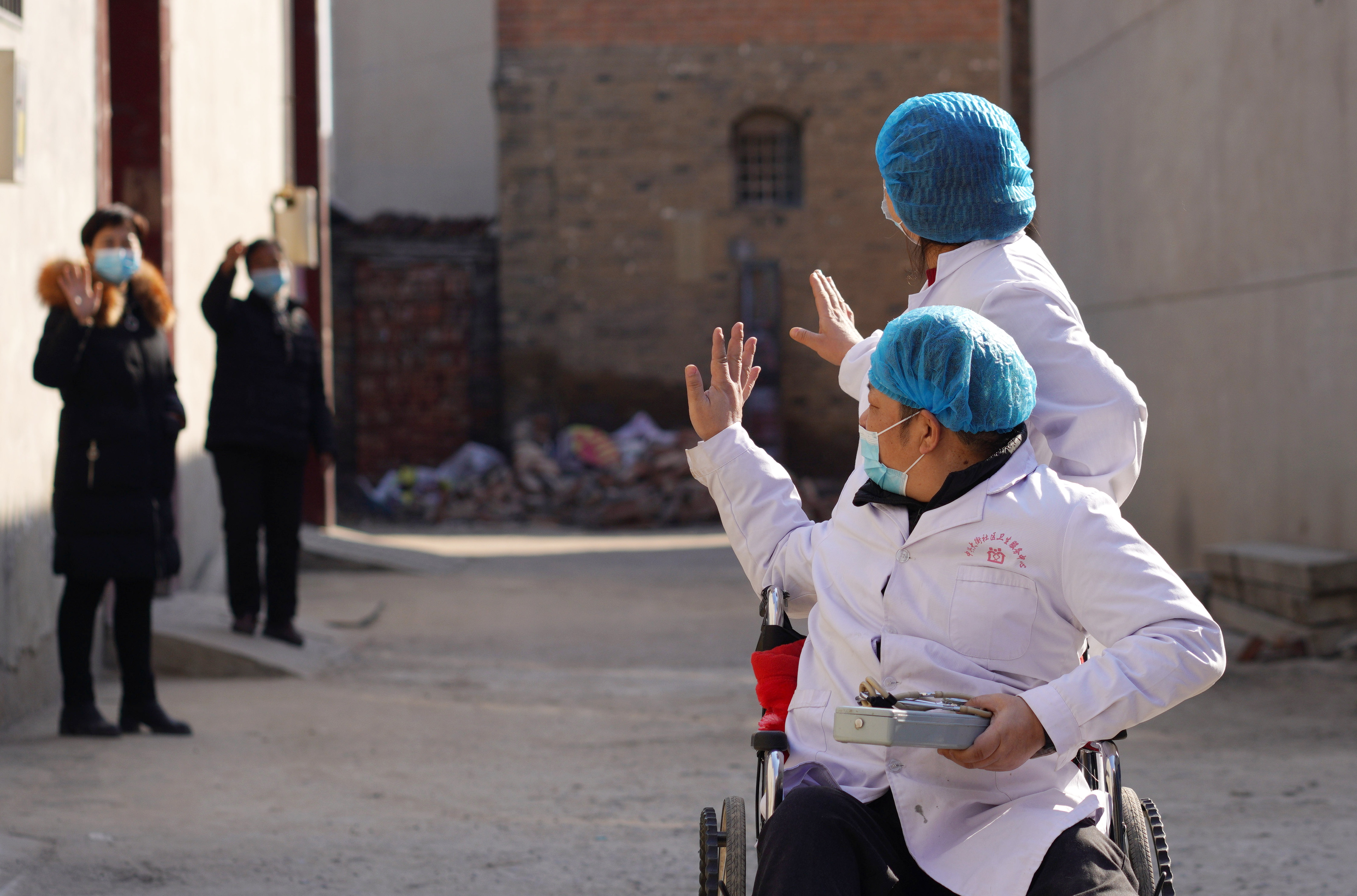 新华社照片,邢台(河北),2022年2月24日 “轮椅村医”焦军营:扎根乡村守护村民健康 2月24日,焦军营(前)入户诊疗后与村民告别。 现年46岁的焦军营是河北省邢台市内丘镇南街村卫生室的一名村医,曾获得河北省、邢台市多项荣誉称号。年幼时,焦军营患小儿麻痹症导致下肢残疾。不屈服于命运的他,从小便立志成为一名医生,把健康带给更多人。 2015年起,焦军营成为南街村村民的签约家庭医生,做起了村民的“健康管家”。量血压、开处方、普及健康养生知识……焦军营每天安排得满满当当。他在做好日常基本诊疗工作的基础上,定期给村里的老人体检,开展慢性疾病随访,为村民建立健康档案。为村民看病之余,焦军营认真学习中医知识,不断丰富自身。 “乡亲们对我的认可,是对我莫大的信任和鞭策。只要乡亲们还需要我,我愿意一直守护他们的健康。”焦军营说。 新华社记者 朱旭东 摄