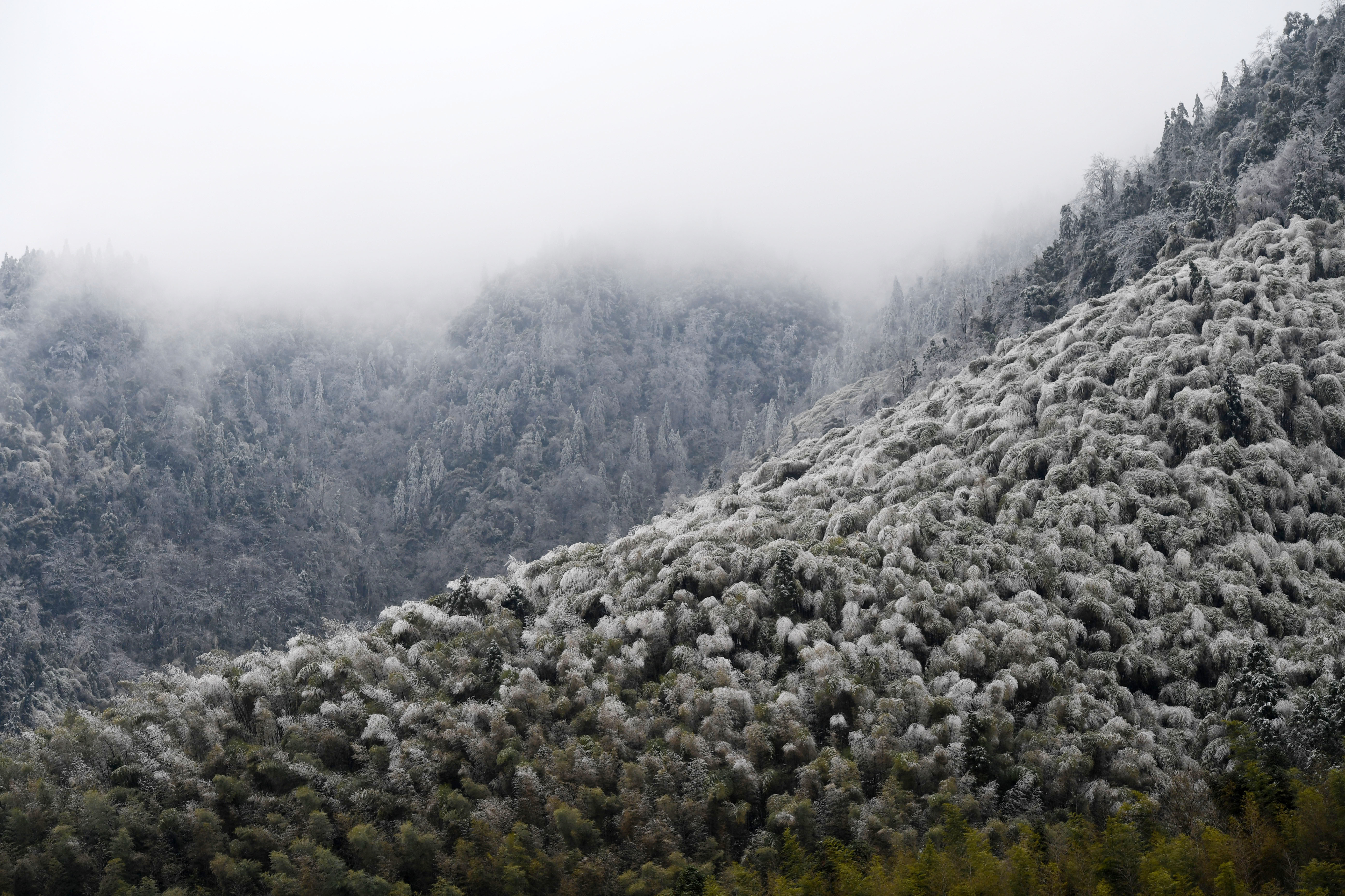 新华社照片,灵川(广西),2022年2月24日 低温冷冻袭广西 这是2月24日拍摄的广西灵川县兰田瑶族乡的山林。 近期,受南支槽和强冷空气影响,广西大部出现小到中雨,部分地区有大雨到暴雨,桂北部分山区出现冰冻、道路结冰或雨夹雪。 新华社记者 陆波岸 摄