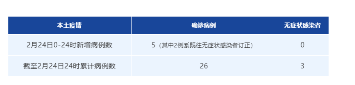 2月24日0-24时,我市新增本土确诊病例5例(其中2例系昨日通报的无症状感染者订正)。截至2月24日24时,我市累计报告本土确诊病例26例,本土无症状感染者3例。