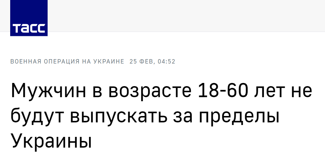 塔斯社:18至60岁男性将不会被允许前往乌克兰境外
