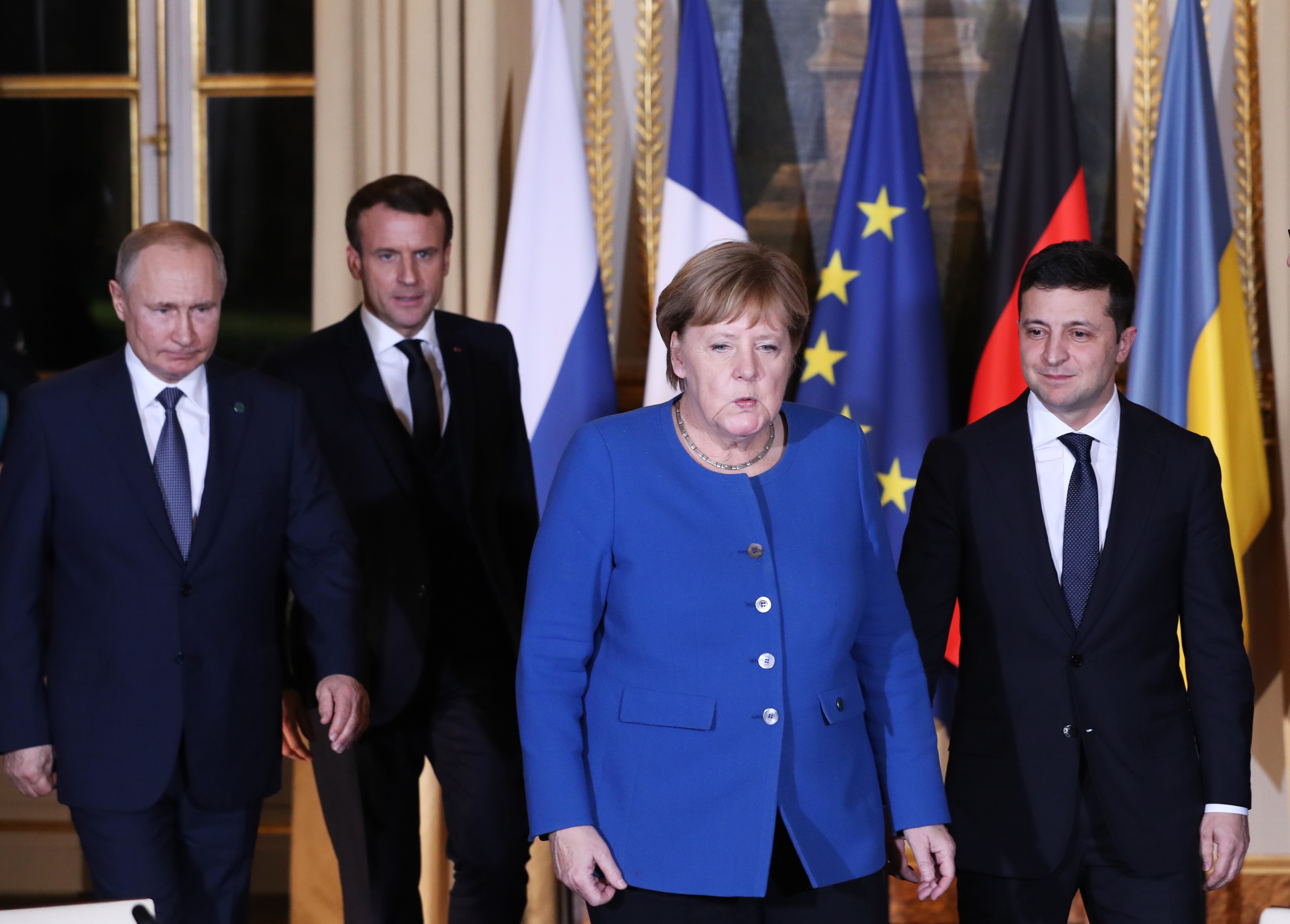 2019年12月9日,在法国巴黎,(从左到右)俄罗斯总统普京、法国总统马克龙、时任德国总理默克尔和乌克兰总统泽连斯基出席“诺曼底模式”四国峰会。(新华社记者高静摄)