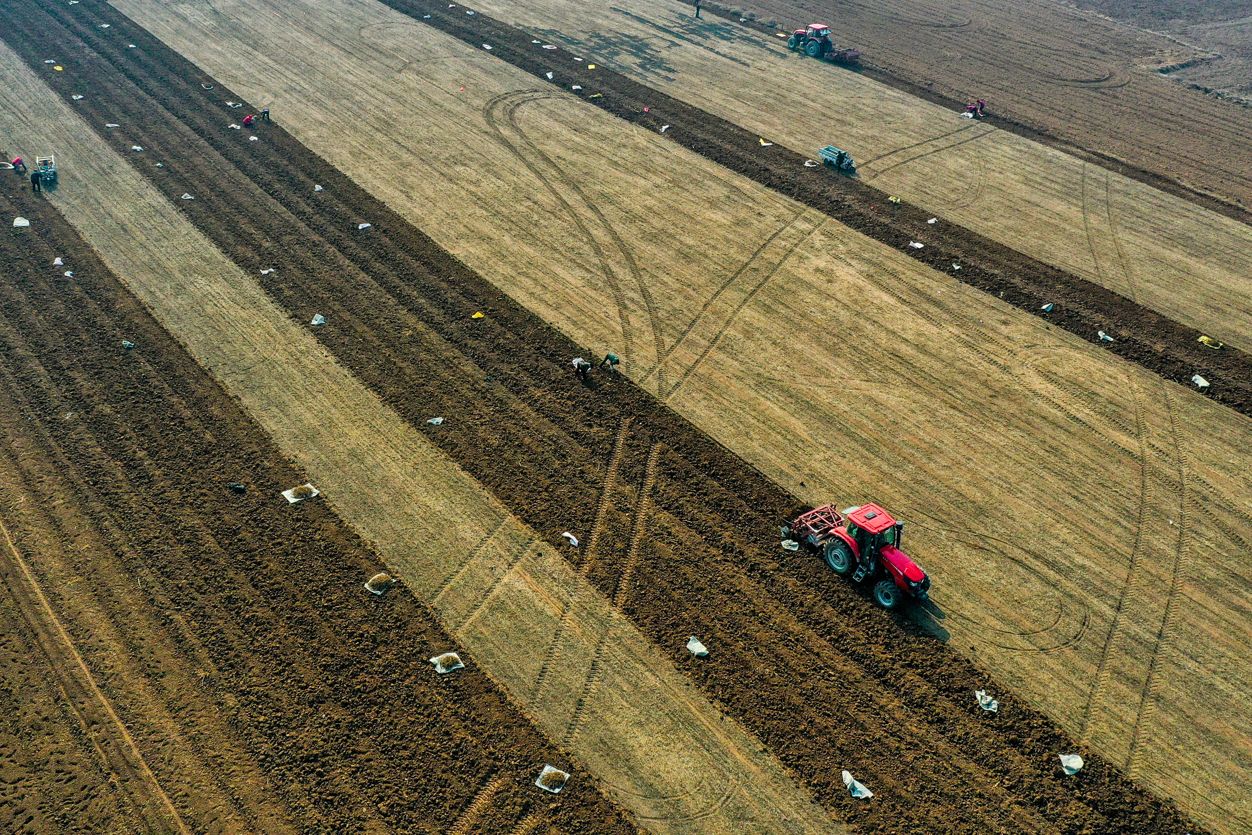 新华社照片,夏县(山西),2022年2月25日 早春农忙正当时 2月24日,运城市夏县瑶峰镇周村村民在田间采收中药材(无人机照片)。 近日,山西省运城市夏县天气转暖,当地农民抢抓农时,开展春季生产,田间地头一派忙碌。 新华社记者 曹阳 摄