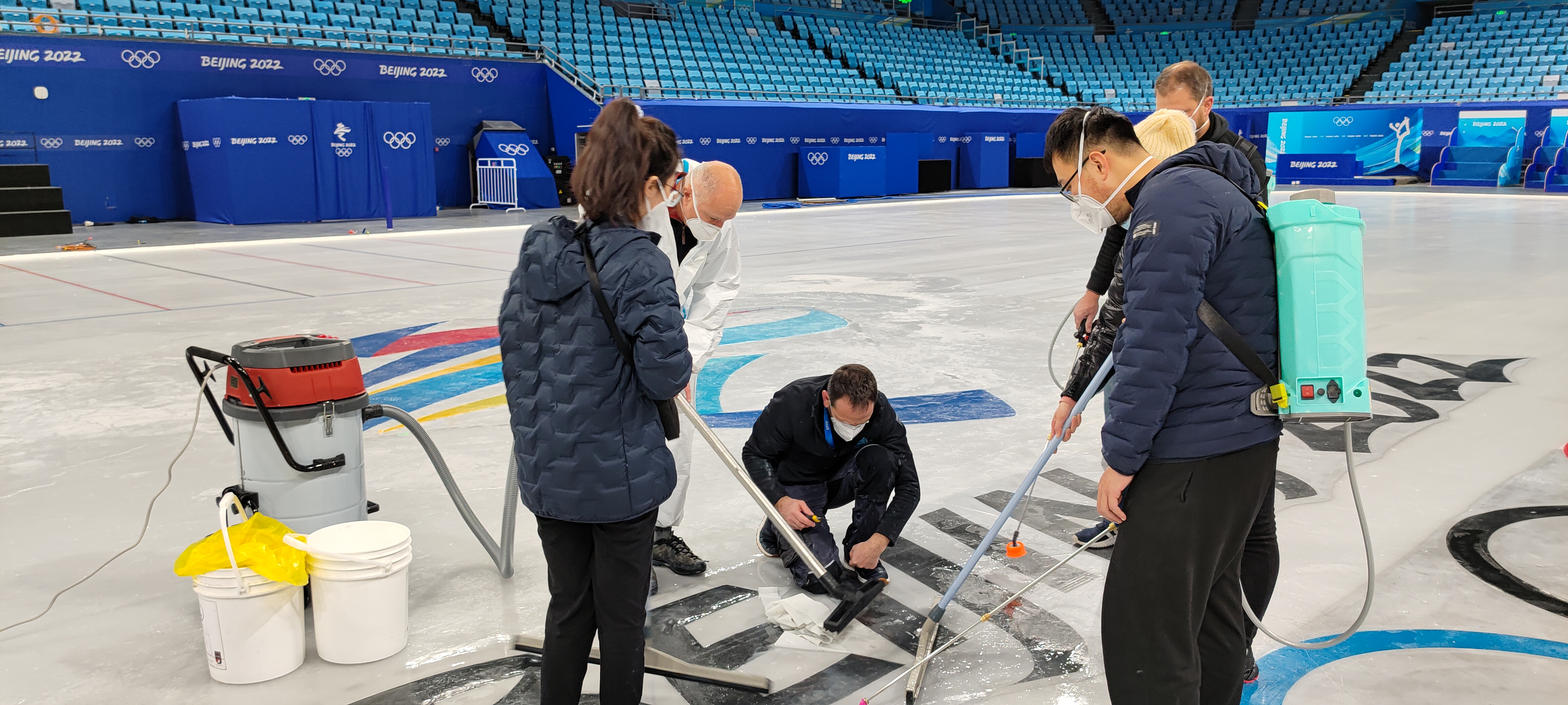 1月11日,首都体育馆外籍制冰专家雷米·博勒(中)在进行冰面制作。新华社发(王小康摄)