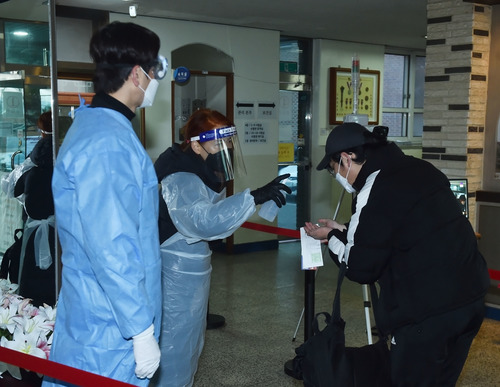 图为2020年12月3日,在韩国京畿道城南市,一名参加韩国大学修学能力考试的考生在进入考场前进行手部消毒。新华社发(李相浩摄)