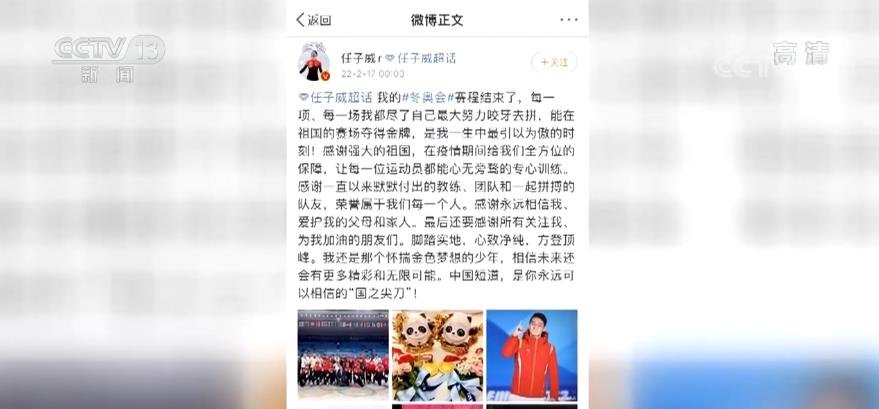 2月17日,任子威在社交媒体(微博)上写道:“我的冬奥会赛程结束了,每一项、每一场我都尽了自己最大努力咬牙去拼,能在祖国的赛场夺得金牌,是我一生中最引以为傲的时刻!中国短道,是你永远可以相信的‘国之尖刀’”!
