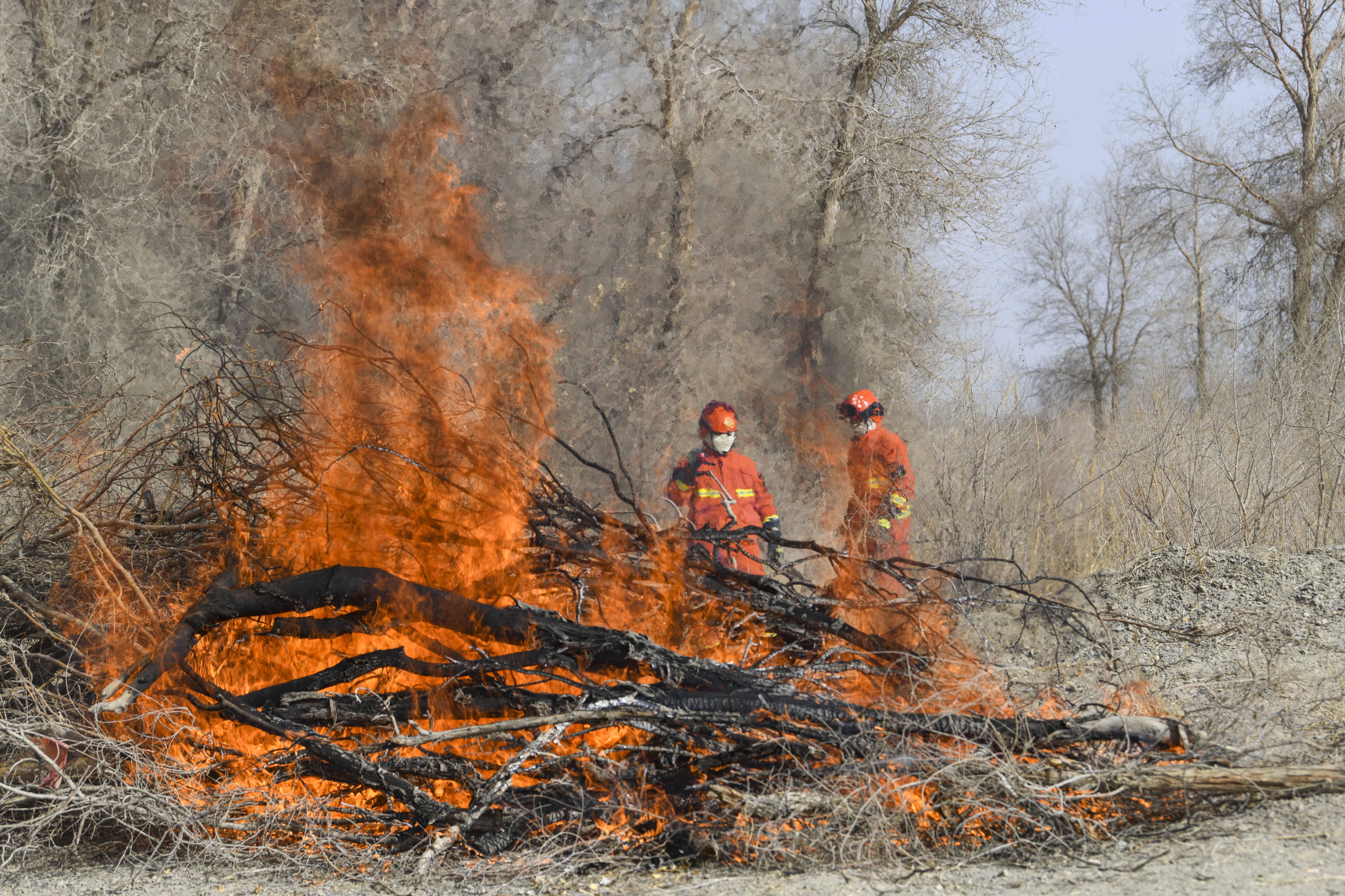 新华社照片,尉犁(新疆),2022年2月25日 美丽的胡杨林深处,有一支护林员消防队 在尉犁县一处胡杨林里,森林草原应急分队成员进行班组灭火行动训练(2月22日摄)。 新疆巴音郭楞蒙古自治州尉犁县位于塔里木河中下游,境内沿河两岸分布着的近百万亩胡杨林,是当地重要的绿洲生态屏障。 守护胡杨林,防火是重中之重。 2021年初,尉犁县林业和草原局从当地190多名护林员中选出7人,组成森林草原应急分队,24小时备勤值班应对初期火情。分队配备了油锯、背负式自动灭火水枪等装备,在当地森林消防支队的指导下学习森林防灭火基础常识,参加火场紧急避险和班组灭火行动等训练,成为胡杨林深处的第一道“防火闸”。 新华社记者 赵戈 摄