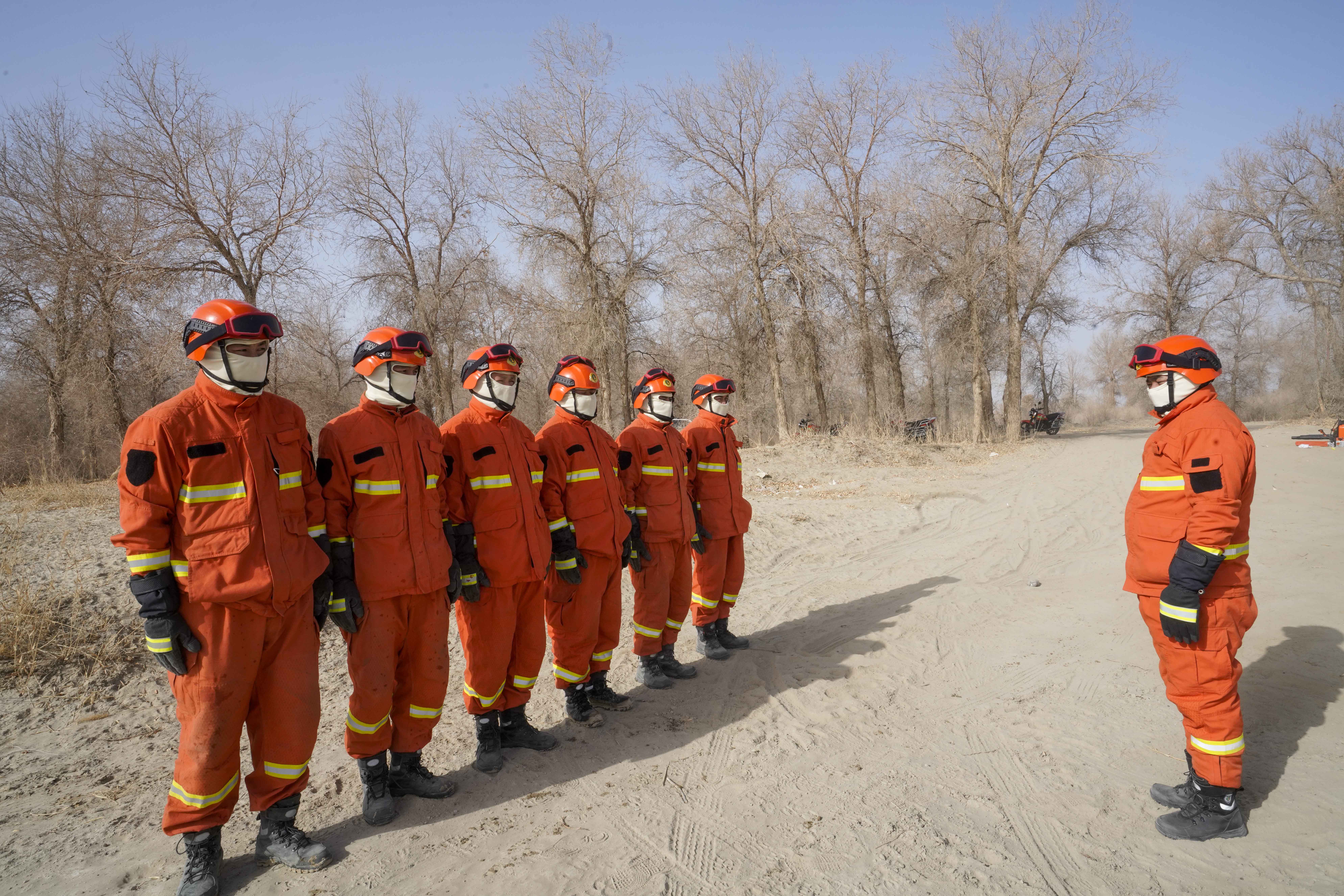 新华社照片,尉犁(新疆),2022年2月25日 美丽的胡杨林深处,有一支护林员消防队 在尉犁县一处胡杨林里,森林草原应急分队成员列队,准备进行班组灭火行动训练(2月22日摄)。 新疆巴音郭楞蒙古自治州尉犁县位于塔里木河中下游,境内沿河两岸分布着的近百万亩胡杨林,是当地重要的绿洲生态屏障。 守护胡杨林,防火是重中之重。 2021年初,尉犁县林业和草原局从当地190多名护林员中选出7人,组成森林草原应急分队,24小时备勤值班应对初期火情。分队配备了油锯、背负式自动灭火水枪等装备,在当地森林消防支队的指导下学习森林防灭火基础常识,参加火场紧急避险和班组灭火行动等训练,成为胡杨林深处的第一道“防火闸”。 新华社记者 赵戈 摄