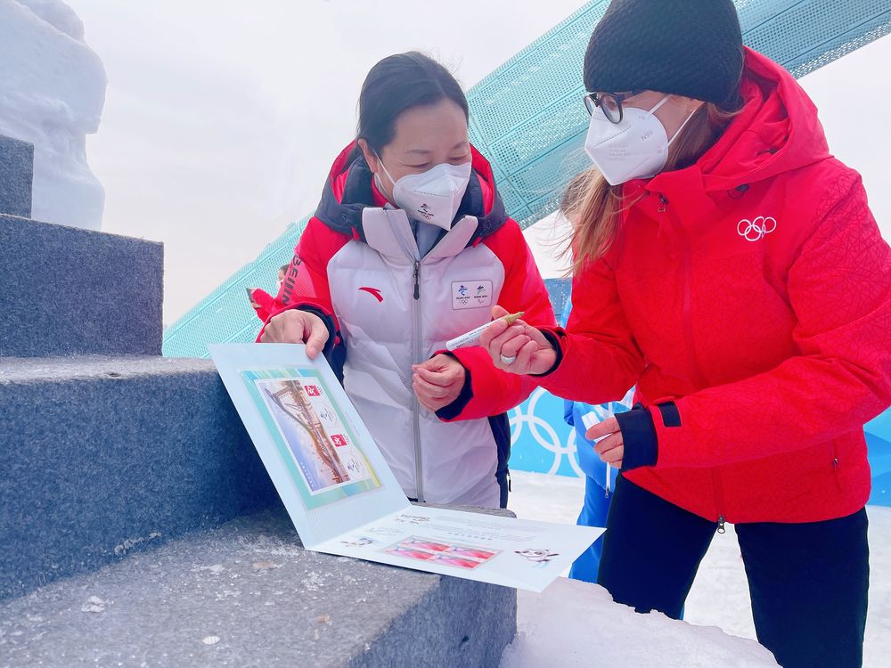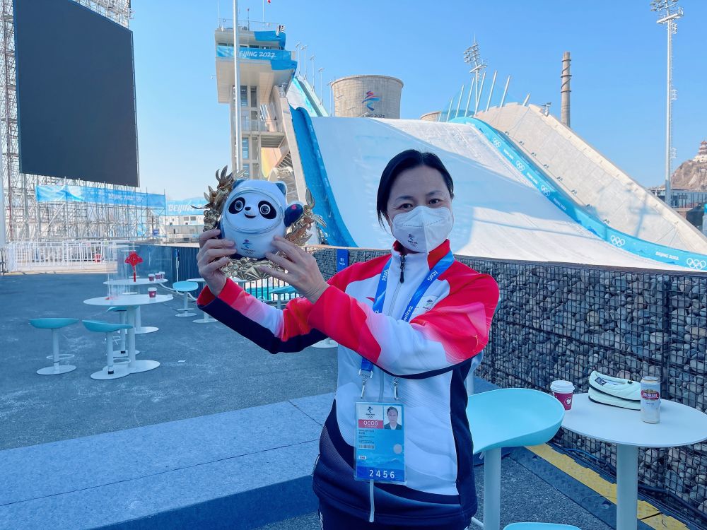 宋世媛拿着“金墩墩”在首钢滑雪大跳台旁留影。新华社发