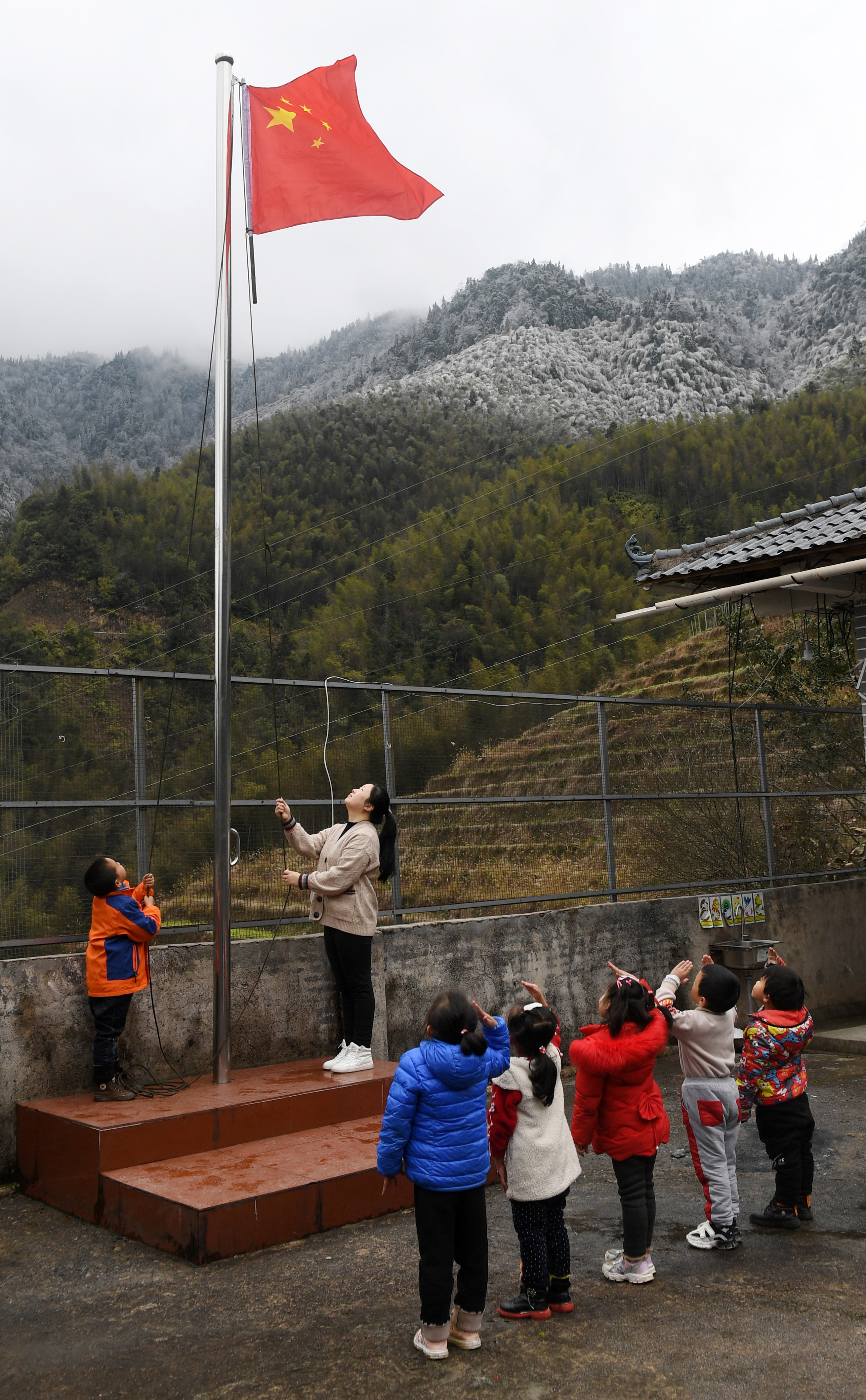 新华社照片,灵川(广西),2022年2月25日 带着母亲儿子去教书 石夏月和学生们一起在教学点的院子里升国旗(2月24日摄)。 拉上母亲,带上儿子,石夏月一头扎进离家35公里的大山,用琅琅书声陪伴山里的孩子,用知识搭起他们走出大山的桥梁。 1988年出生的石夏月,家住广西灵川县兰田瑶族乡兰田村。大学毕业后,她曾在广东从事幼教工作,也在政府部门做过信息员。2019年,她通过考试成为一名教师。出于对家乡的眷恋,石夏月选择回到乡里,在东良教学点任教。 从兰田村到教学点,山路蜿蜒,骑摩托车单程也要一个多小时。为了兼顾家人和工作,石夏月把儿子和母亲接到学校一起生活。 目前,东良教学点有6名学生,石夏月是他们唯一的老师。从教学到生活,从早到晚,石夏月都在围着学生转。 对于这份职业,石夏月心中有着满满的获得感和责任感。“每听到学生叫一声老师,我心里都特别高兴,特别满足。”石夏月说,她将继续坚守,把自己的所见所学都传授给孩子们,帮助他们走向更加美好广阔的世界;更期盼他们学成后,能回来跟老师分享他们学到的东西、看到的世界。 新华社记者 陆波岸 摄