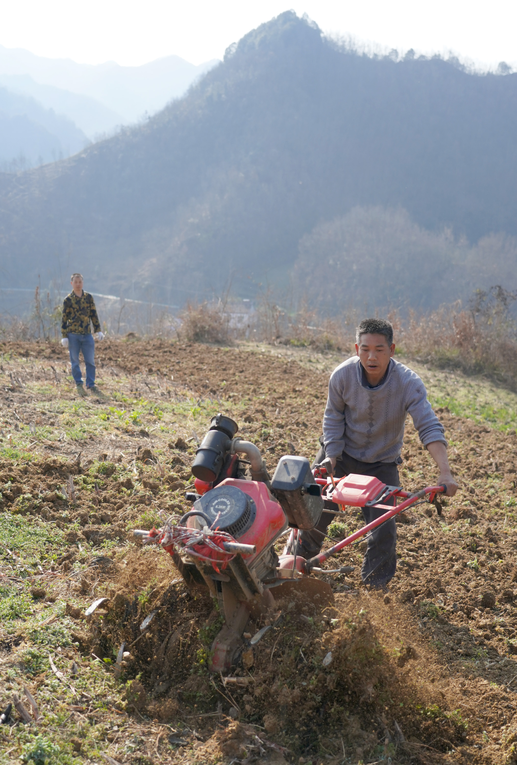 新华社照片,安康(陕西),2022年2月25日 秦巴山区春耕忙 2月24日,汉滨区县河镇毛坝村村民使用旋耕机翻地。 眼下,在地处秦巴山区的陕西省安康市汉滨区,农民抢抓农时开展春耕春管,从田间到大棚一派农忙景象。 新华社记者 邵瑞 摄