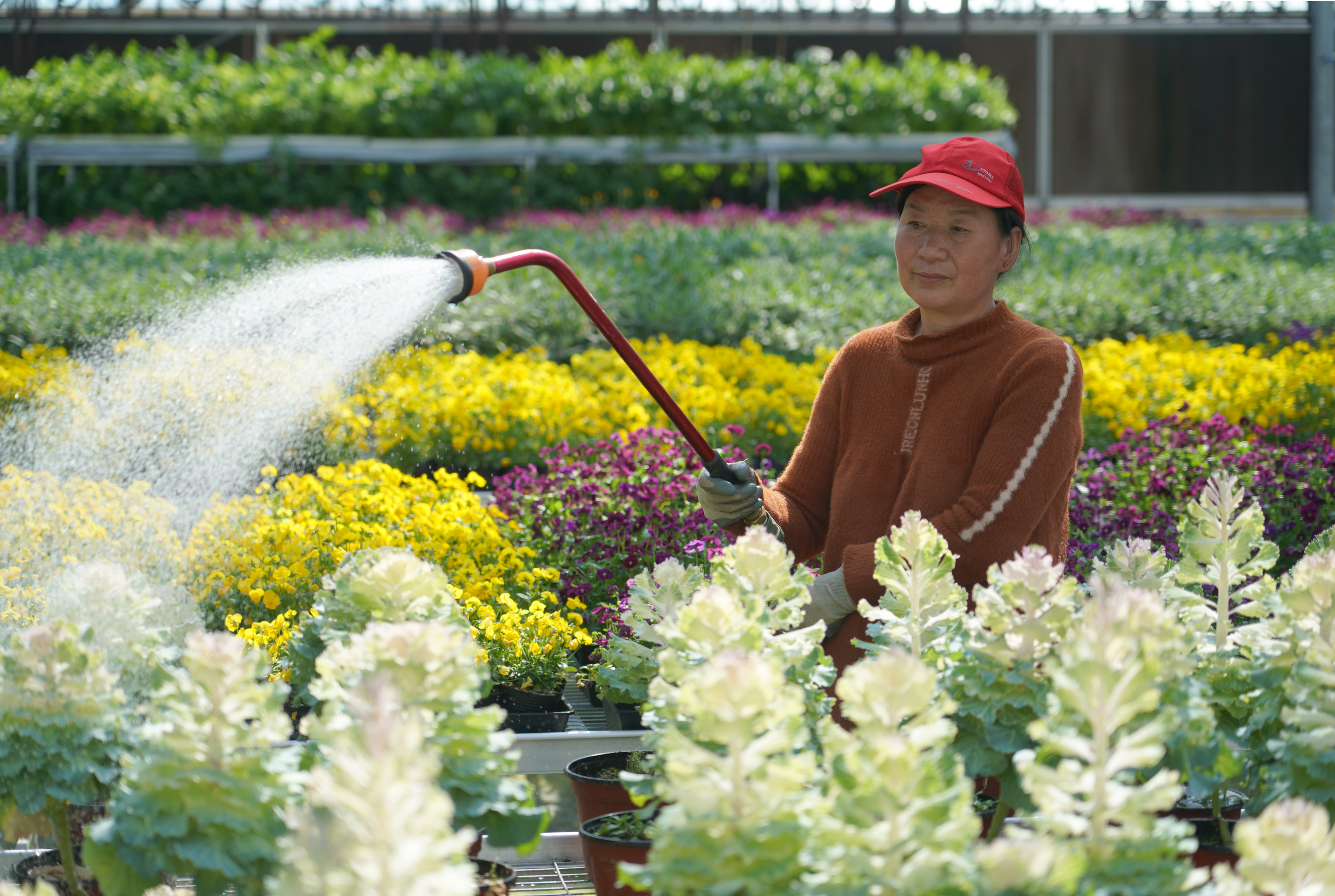 新华社照片,安康(陕西),2022年2月25日 秦巴山区春耕忙 2月24日,在汉滨区建民街道忠诚村集体股份经济合作社大棚内,村民给观赏盆景浇水。 眼下,在地处秦巴山区的陕西省安康市汉滨区,农民抢抓农时开展春耕春管,从田间到大棚一派农忙景象。 新华社记者 邵瑞 摄