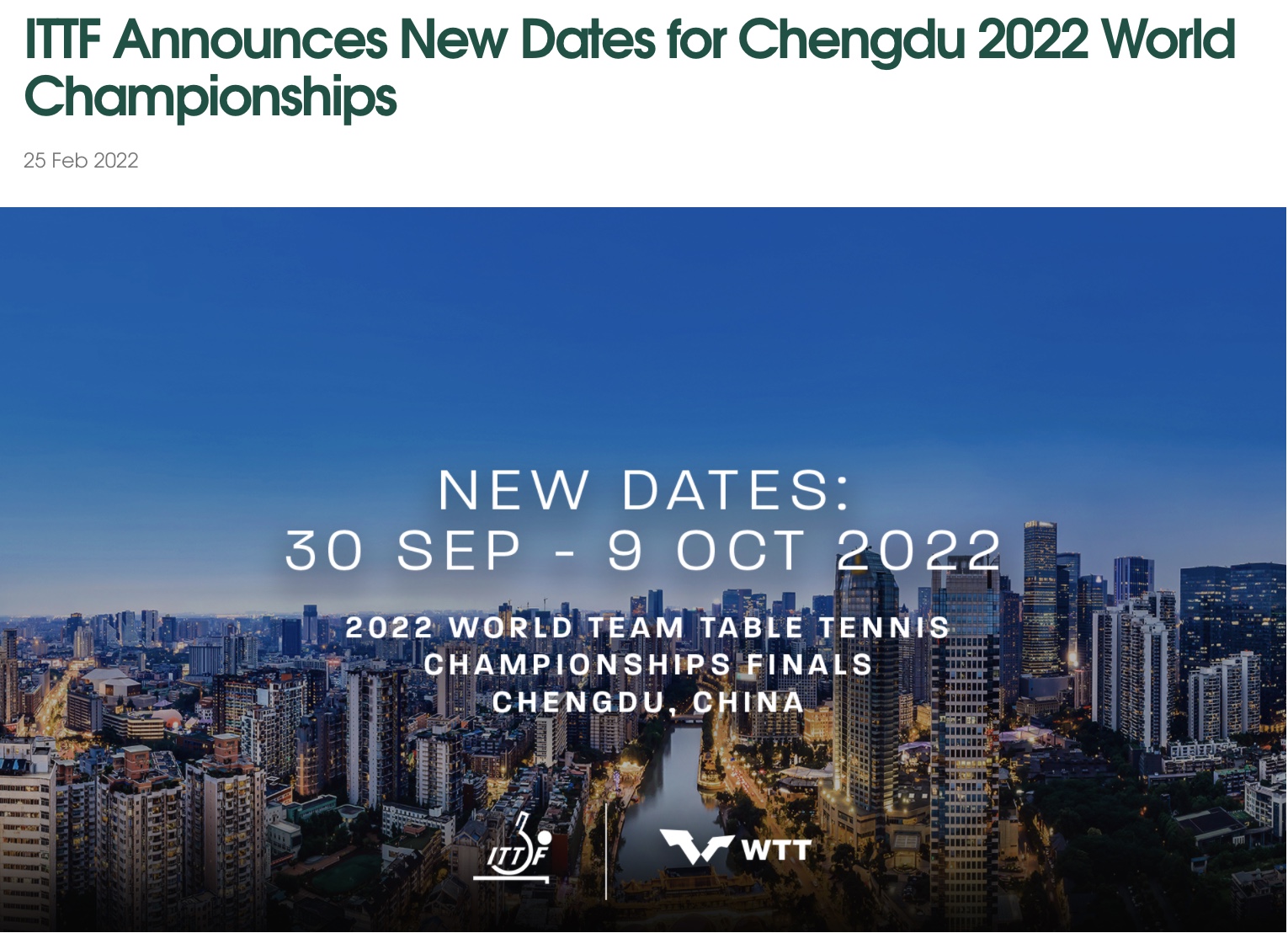 新华社成都2月25日电(记者陈地)国际乒乓球联合会25日宣布,鉴于现阶段变异新冠病毒奥密克戎毒株正持续传播,在与中国乒乓球协会和成都市有关部门密切磋商后,决定将原定于今年4月举行的2022年成都世界乒乓球团体锦标赛延期至2022年9月30日至10月9日举行。