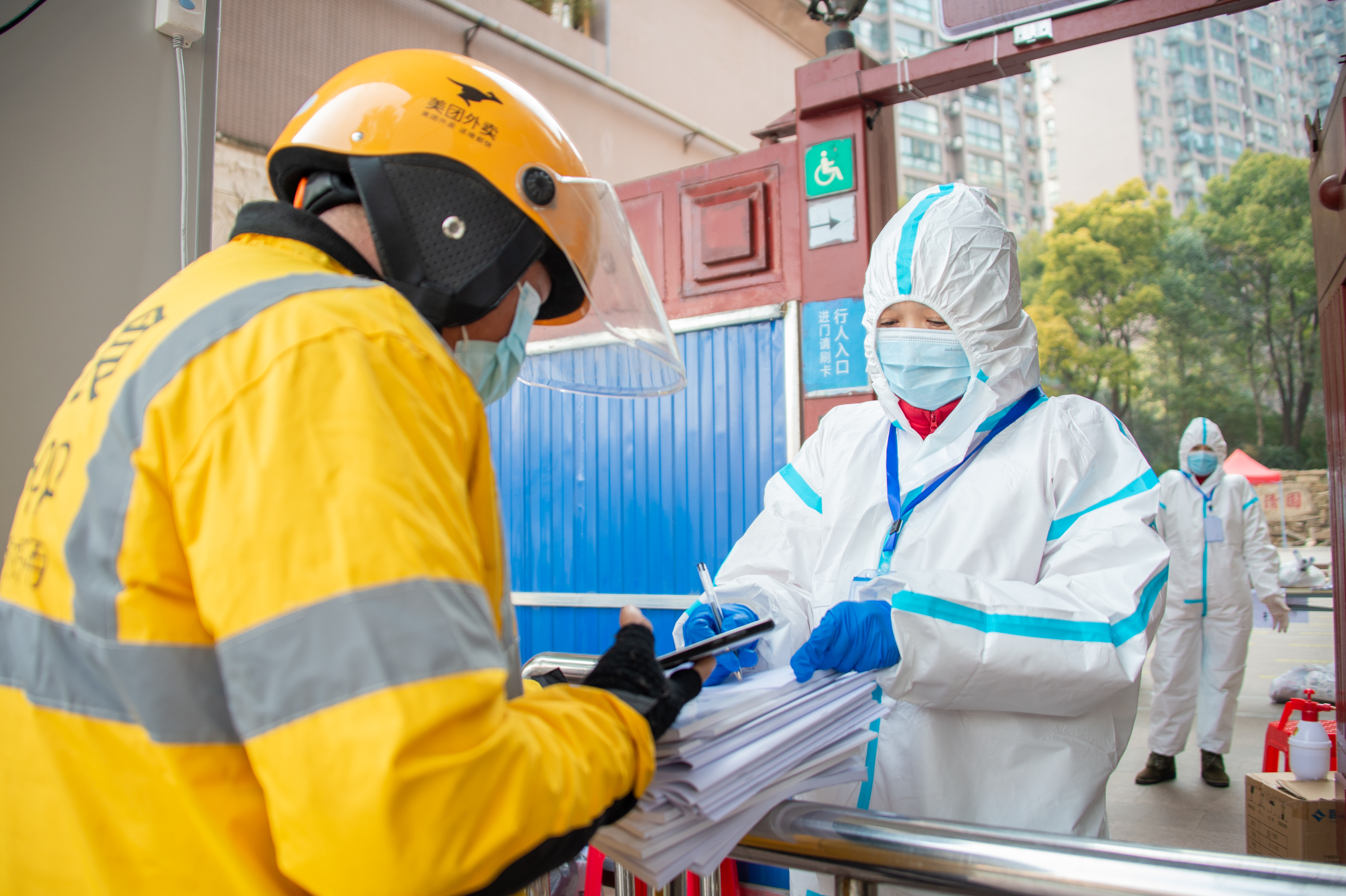 新华社照片,武汉,2022年2月25日 快速精准、严格有序——武汉阻击奥密克戎 2月24日,配送人员将一份考试资料送到实施封控管理的武汉市江岸区华清园小区门口,由社区志愿者转交给居民。 (配本社同题文字稿) 新华社发(伍志尊摄)
